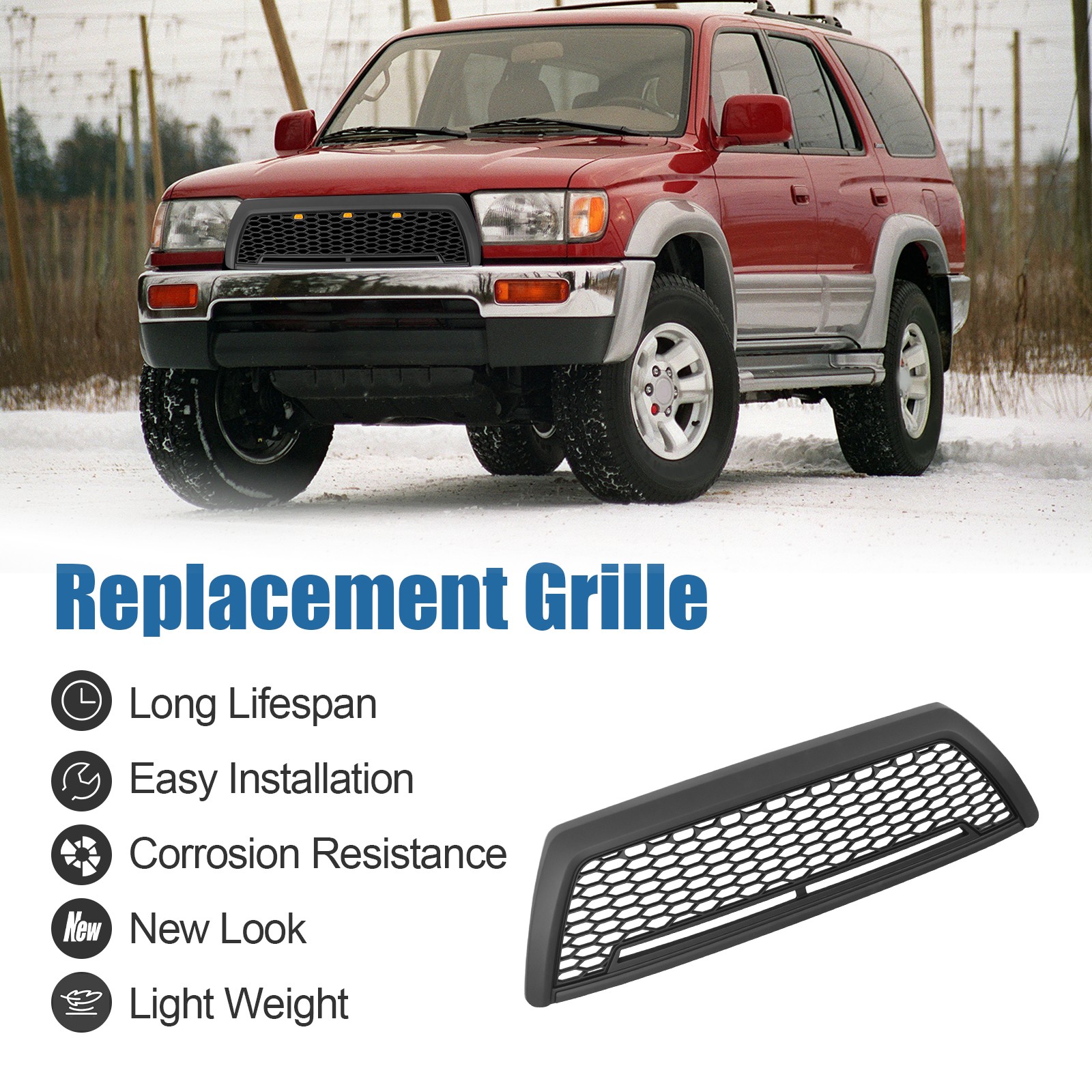### Specification Type: Grill Condition: New Color: Black Material: plastic Package Dimensions(LengthxWidthxHeight:in):40.95\*4.34\*13.39 Package Weight(lbs):6.29 ### Features & Benefits 1\. \*\*Appearance design and style\*\*: The centre mesh can significantly enhance the overall visual effect of the vehicle and highlight different styles. 2\. \*\*Materials and durability\*\*: The centre mesh usually has good corrosion resistance and weather resistance, which can keep the appearance clean for a long time and adapt to various climatic conditions. 3\. \*\*Functionality\*\*: The centre grille is not only a decorative part, but also undertakes the function of heat dissipation and ventilation to protect the internal parts. 4\. \*\*Aerodynamic optimisation\*\*: the mesh optimises airflow and reduces wind resistance. 5\. \*\*Personalisation and Modification Potential\*\*: the centre mesh is one of the popular parts for car exterior modification, meeting the demand for personalisation.