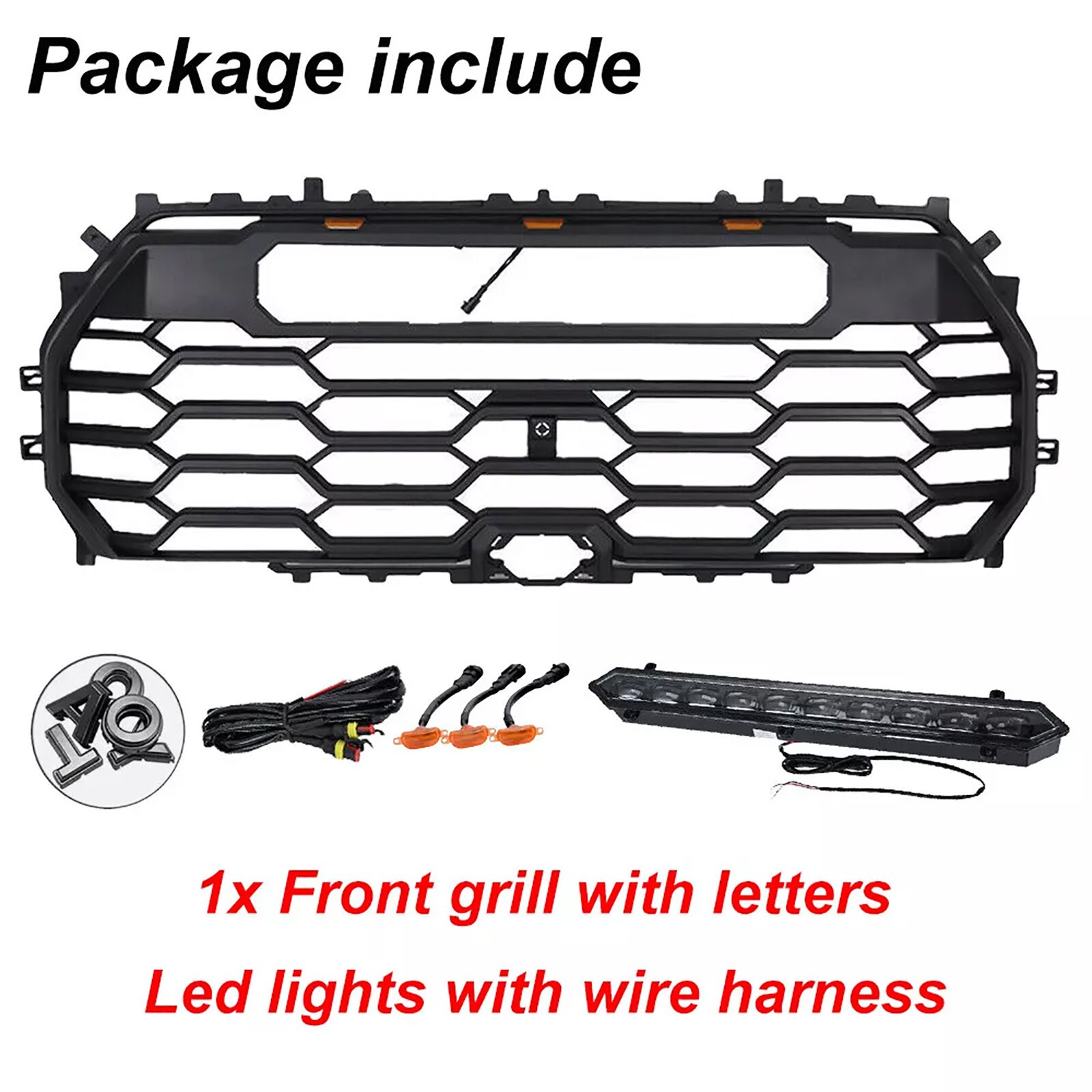 - Items Included: Front Grille, Letters, LED Lights, Mounting Hardware, Screws, Light Bar