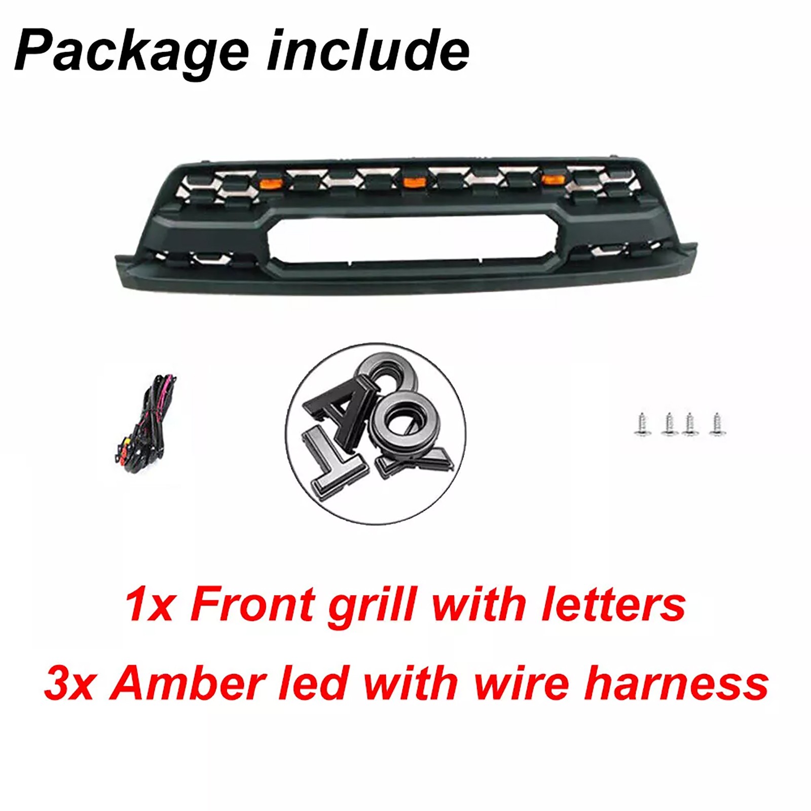 - Items Included: Bolts, Front Grille, Letters, LED Lights