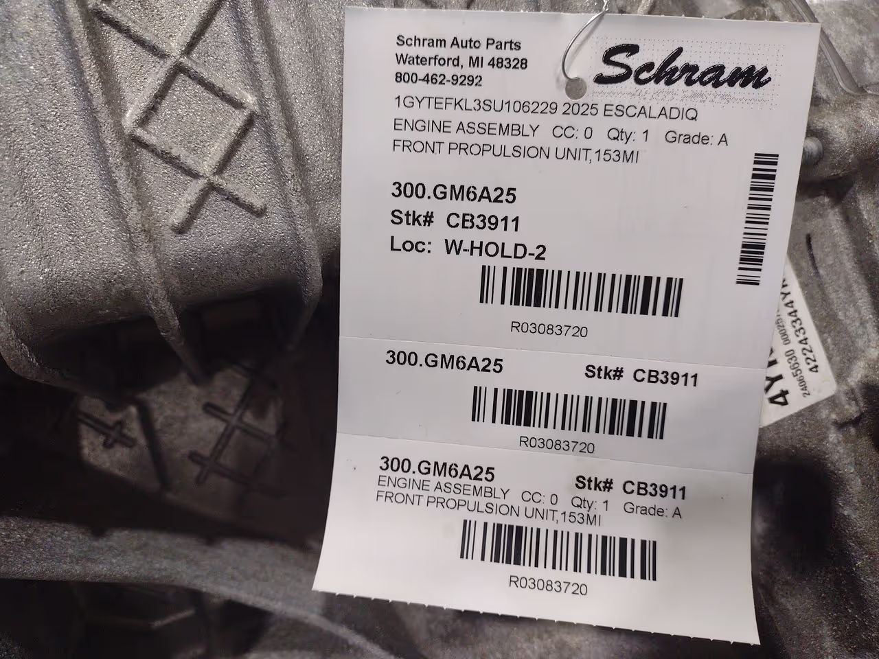 Description FRONT PROPULSION UNIT,153MI Mileage: 0 This item will fit the following vehicles/applications: **Original Equipment Replacement: Electric Drive Motor Propulsion Unit** **Schram Auto and Truck Parts – Electric Vehicle Drive Motor Assembly** Repair or upgrade your electric or hybrid vehicle with a genuine **OEM Electric Drive Motor Propulsion Unit** from Schram Auto and Truck Parts. This listing is for a front, rear, or all-wheel drive motor assembly, removed from a donor vehicle and inspected for resale. These orignial equipment high-voltage propulsion units are designed for seamless fitment and reliable performance in the specific makes and models listed in the 'Interchange' section of this listing. **What’s Included** This Drive Motor Propulsion Unit may include attached components such as inverters, cooling elements, or wiring stubs **if shown in the pictures or stated in the Conditions and Options section**. Control modules (ECUs/TCMs), mounts, and auxiliary systems are not guaranteed to be included unless specifically noted. Please inspect all photos and read the item notes carefully to understand what is included. Buyer is responsible for confirming fitment and configuration requirements for their vehicle. **Professional Installation Recommended** Due to the specialized nature of electric vehicle systems and high-voltage components, **installation must be performed by a qualified EV technician or certified repair facility**. These units are not plug-and-play swaps and may require dealer-level programming, software updates, or pairing to function correctly with your vehicle’s electrical architecture. **Warranty and Quality Assurance** All drive motors are backed by a 90-day **Parts-Only Warranty** when installed by a licensed mechanic or shop. Additional extended warranty options may be available—please inquire before purchase for details and pricing. Our parts are sourced from low-mileage vehicles and quality-checked prior to shipment. **Ask Chad – Get Expert Help** If you're not sure this is the right unit for your EV or hybrid, reach out to us before purchasing. He’ll help verify compatibility using your VIN and ensure a smooth, confident buying experience. Choose Schram Auto and Truck Parts for reliable, high-quality electric propulsion systems backed by over a century of automotive experience. Vehicle 2025 ESCALADIQ Mileage 0 Part Grade A What's this?
