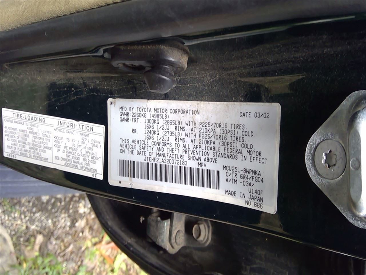 - VIN #: JTEHF21A320072183