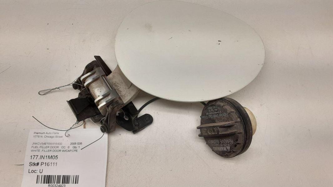 Description Donor Vehicle VIN: JNKCV54E15M416400 Model: G35 Year: 2005 Mileage: 144000 (0 = not available or unknown) Stock Number: P16111 Store Number: 1 Part Detail Part Grade: Part Category: U Part Placement: Notes: WHITE ,FILLER DOOR W/CAP,CPE This part will fit these makes and models with these options WARRANTY / GUARANTEE **Return Policy** All parts we sell come with a **60 Day Money Back Guarantee** unless otherwise stated. The 60 day period starts when you take possession of the part. We do not cover the cost of labor charges during the installation of your parts. All original shipping costs are non-refundable and will be deducted by a restocking fee once the item is received. We do not cover any shipping costs and will deduct 20% to cover original shipping even if the listing says "free shipping". **Standard Warranty** We offer a standard warranty on all mechanical parts. This covers the part only, no labor charges to install the part. We are not responsible for any improper installation or misdiagnosis. Parts must be installed by a proffessional shop or mechanic. Parts that are disfunctional or bad will require paperwork along with the return or a 20% restocking fee will be applied. SHIPPING NOTESABOUT USHELP **Premium Auto Parts, Inc.** ships to US addresses within the continental 48 states. **Shipping to Alaska, Hawaii, Puerto Rico, APO, FPO or PO Box addresses** is available for select parts only. **Local Pick-up at our facilities is available.** Please contact us prior to your purchase to arrange local pick-up. Buyer must contact us prior to local pick-up. **Items returned by the buyer-** All returns are subject to a restocking fee, this restocking fee is to cover our original shipping costs. Restocking fee will be applied to all items that are returned by the buyer with no fault of the seller. This includes any items ordered incorrectly ( it is 100% buyer responsiblility to check compatability by vin number before ordering). **Please contact us prior to purchasing this part** if you have any questions regarding our business policies, the warranties or guaranties we offer or the fitment of this part with your vehicle. **Parts Grading.** A standard code system is used to communicate the condition and quality of a part between automotive recyclers, automotive repair shops, and insurers. Knowing how these codes are used will help you understand whether the part meets your expectations before you buy it and what you can expect from the part when you receive it. **A Grade** \- The highest quality part. It is of low miles and/or exceptional condition for its age. **B Grade** \- The second level quality part. It is of average miles and normal condition for its age. **C Grade** \- The third level quality part. It has high miles and/or light damage. **No Grade** \- A part that has not yet been graded.