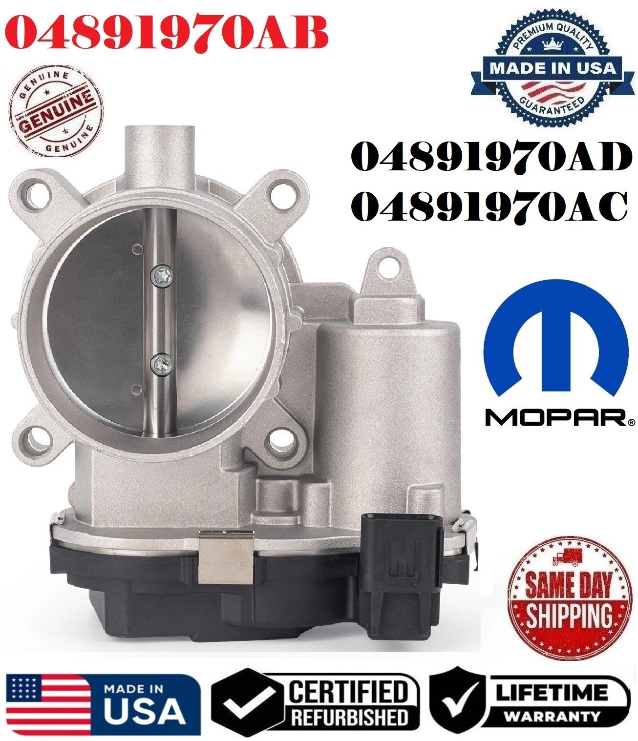 \*\*\*REMANUFACTURED GENUINE MOPAR\*\*\* THROTTLE BODY \\*\\*\\* THISIS NOT aftermarket\*\*\* **_Part Number #_** **04891970AB , 04891970AD , 04891970AC** \*\*\*FREE SAME DAY SHIPPING & LIFETIME WARRANTY\*\*\* **Please use our compatibility chart or verify with your part number to see if these parts are right for your car!!!** **_Fits On_** - **2015-2017 CHRYSLER 200 2.4L** - **2013-2016 DODGE Dart 2.0L 2.4L** - **2016-2018 FIAT 500x 2.4L** - **2014-2019 JEEP Cherokee 2.4L** - **2017-2022 JEEP Compass 2.4L** - **2015-2021 JEEP Renegade 2.4L** - **2015-2022 RAM Promaster City 2.4L** PLEASE NOTE: YOU WILL RECEIVE THIS PRODUCT EXACTLY AS SHOWN IN THE PICTURE ! - **INTERNALLY AND EXTERNALLY CLEANED WITH VARIOUS ULTRASONIC TREATMENTS USING THE LATEST EQUIPMENT IN THE INDUSTRY.** - **ALL PARTS ARE CHECKED FOR MAJOR DAMAGES & CRACKS, TESTED BEFORE SHIPPING.** - **ALL REMANUFACTURED ITEMS WERE PREVIOUSLY USED MAY HAVE LIGHT SCRATCHES, FADED COLORS AND SIGNS OF USAGE. HOWEVER, THEY STILL FUNCTION AS IF THEY WERE NEW.** **Shipping:** **_Once we have received cleared payment, your item will be shipped within 24 hours Monday-Saturday \[US Holidays excluded\] via USPS. Express shipping options are available, please contact us to inquire._** **Return:** **_Returns are accepted within 30 days of purchase. Please note that all products must include all accessories, adapter, seals, paper work, etc. There will be a 20% restocking fee for opening item(s) based on conditions. We suggest you use a traceable method of shipping as we cannot be held responsible for any lost items._** **THE FITMENT INFORMATION MIGHT NOT BE 100% ACCURATE, THEREFORE,** **IT'S BUYER'S RESPONSIBILITY TO MATCH THE PART# AND CONFIRM THE FITMENT BEFORE MAKING A PURCHASE.** **DISCLAIMER** **+We do not guarantee labor. We do not assume liability for any claims for more than the purchase price of the item+**