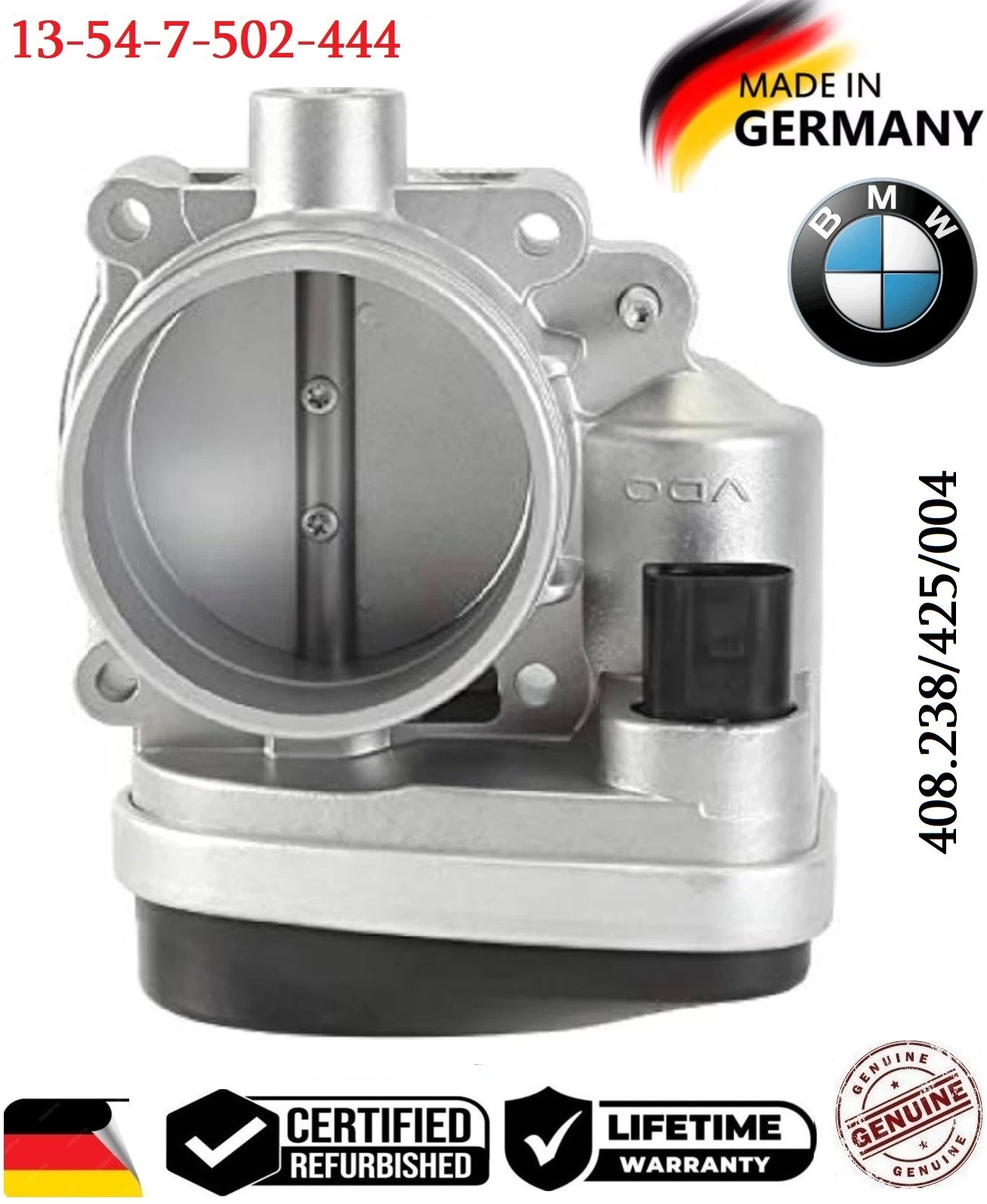 **\*\***REMANUFACTUREDGENUINE BMW **\*\*** **_Throttle Body_** NOT aftermarket\*\*\* **_Part Number #_** **_13-54-7-502-444_** **_Other_ _Part Number_#** **408.238/425/004** **Please use our compatibility chart or verify with your part number to see if these parts are right for your car!!!** **_Fits On 2.5L I6_** - **2001-2005 BMW 325i 2.5L I6** - **2001-2006 BMW 325Ci 2.5L I6** - **2001-2005 BMW 325Xi 2.5L I6** - **2004-2006 BMW X3 2.5L I6** - **2001-2002 BMW Z3 2.5L I6** - **2003-2005 BMW Z4 2.5L I6** - **2001-2006 BMW 525i 2.5L I6** PLEASE NOTE: YOU WILL RECEIVE THIS PRODUCT EXACTLY AS SHOWN IN THE PICTURE ! - **INTERNALLY AND EXTERNALLY CLEANED WITH VARIOUS ULTRASONIC TREATMENTS USING THE LATEST EQUIPMENT IN THE INDUSTRY.** - **ALL PARTS ARE CHECKED FOR MAJOR DAMAGES & CRACKS, TESTED BEFORE SHIPPING.** - **ALL REMANUFACTURED ITEMS WERE PREVIOUSLY USED MAY HAVE LIGHT SCRATCHES, FADED COLORS AND SIGNS OF USAGE. HOWEVER, THEY STILL FUNCTION AS IF THEY WERE NEW.** **Shipping:** **_Once we have received cleared payment, your item will be shipped within 24 hours Monday-Saturday \[US Holidays excluded\] via USPS. Express shipping options are available, please contact us to inquire._** **Return:** **_Returns are accepted within 30 days of purchase. Please note that all products must include all accessories, adapter, seals, paper work, etc. There will be a 20% restocking fee for opening item(s) based on conditions. We suggest you use a traceable method of shipping as we cannot be held responsible for any lost items._** **THE FITMENT INFORMATION MIGHT NOT BE 100% ACCURATE, THEREFORE,** **IT'S BUYER'S RESPONSIBILITY TO MATCH THE PART# AND CONFIRM THE FITMENT BEFORE MAKING A PURCHASE.**