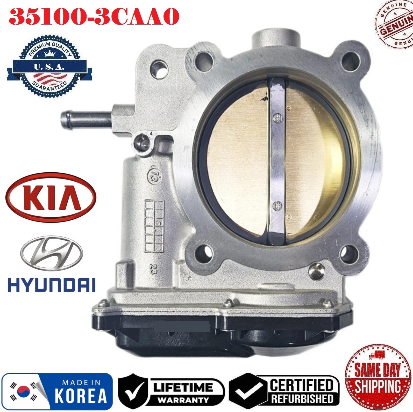 **\*\*** **REMANUFACTURED** **GENUINE** **HYUNDAI KIA** **\*\*** **_Throttle Body_** Part# **35100-3CAA0 , 351003CAA0** **35100 3CAA0** **_Fits On_** - **2012-2017 HYUNDAI Azera 3.3L V6** - **2013-2018 HYUNDAI Santa Fe 3.3L V6** - **2019 HYUNDAI Santa Fe XL 3.3L V6** - **2014-2018 KIA Cadenza 3.3L V6** - **2015-2018 KIA Sedona 3.3L V6** - **2014-2018 KIA Sorento 3.3L V6** PLEASE NOTE: YOU WILL RECEIVE THIS PRODUCT EXACTLY AS SHOWN IN THE PICTURE ! - **INTERNALLY AND EXTERNALLY CLEANED WITH VARIOUS ULTRASONIC TREATMENTS USING THE LATEST EQUIPMENT IN THE INDUSTRY.** - **ALL PARTS ARE CHECKED FOR MAJOR DAMAGES & CRACKS, TESTED BEFORE SHIPPING.** - **ALL REMANUFACTURED ITEMS WERE PREVIOUSLY USED MAY HAVE LIGHT SCRATCHES, FADED COLORS AND SIGNS OF USAGE. HOWEVER, THEY STILL FUNCTION AS IF THEY WERE NEW.** **Shipping:** **_Once we have received cleared payment, your item will be shipped within 24 hours Monday-Saturday \[US Holidays excluded\] via USPS. Express shipping options are available, please contact us to inquire._** **Return:** **_Returns are accepted within 30 days of purchase. Please note that all products must include all accessories, adapter, seals, paper work, etc. There will be a 20% restocking fee for opening item(s) based on conditions. We suggest you use a traceable method of shipping as we cannot be held responsible for any lost items._** **THE FITMENT INFORMATION MIGHT NOT BE 100% ACCURATE, THEREFORE,** **IT'S BUYER'S RESPONSIBILITY TO MATCH THE PART# AND CONFIRM THE FITMENT BEFORE MAKING A PURCHASE.** **DISCLAIMER** **+We do not guarantee labor. We do not assume liability for any claims for more than the purchase price of the item+**