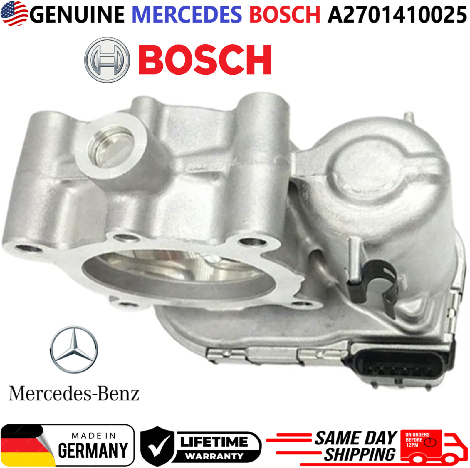 REMANUFACTURED GENUINE BOSCH MERCEDES-BENZThrottle Body For 2014-2020 Mercedes-Benz CLA250 GLA250 C300 E300 Metris 2.0L I4 Turbo \*\*\*These Parts are NOT aftermarket\*\*\* \*\*\*FREE SAME DAY SHIPPING & LIFETIME WARRANTY\*\*\* \*\*\*MADE IN GERMANY\*\*\* **Manufacturer Part Number: A2701410025, A 270 141 00 25, 0280750541** **Please use our compatibility chart or verify with your part number to see if these parts are right for your car!!!** Compatible Vehicles, Throttle Body For: **\> 2014, 2015, 2016, 2017, 2018, 2019 Mercedes-Benz CLA250 (C117) 2.0 L I4 Turbo** **>** **2015, 2016, 2017, 2018, 2019, 2020 Mercedes-Benz GLA250 (X156) 2.0 L I4** **Turbo** **>** **2015, 2016, 2017, 2018, 2019 Mercedes-Benz C300 (W205) 2.0 L I4** **Turbo** **>** **2015, 2016, 2017, 2018, 2019 Mercedes-Benz E300 / E350e (W213) 2.0 L I4** **Turbo** **>** **2016, 2017, 2018, 2019 Mercedes-Benz Metris (V-Class) 2.0 L I4** **Turbo** PLEASE NOTE: YOU WILL RECEIVE THIS PRODUCT EXACTLY AS SHOWN IN THE PICTURE!!! - **ALL OF OUR PARTS COME WITH NEW NEW HIGH-QUALITY COMPONENTS SUCH AS O-RINGS, SEALS, GASKETS ETC.** - **INTERNALLY AND EXTERNALLY CLEANED WITH VARIOUS ULTRASONIC TREATMENTS USING THE LATEST EQUIPMENT IN THE INDUSTRY.** - **ALL PARTS ARE CHECKED FOR MAJOR DAMAGES & CRACKS, ALL PARTS ARE TESTED BEFORE SHIPPING.** - **ALL REMANUFACTURED PARTS WERE PREVIOUSLY USED MAY HAVE LIGHT SCRATCHES, FADED COLORS AND SIGNS OF USAGE. HOWEVER, THEY STILL FUNCTION AS IF THEY WERE NEW.** Highly Recommended: - Before installation, you must lubricate all seals and O-rings!!! - We highly recommend any auto part to be installed by a professional mechanic. - We are not responsible for any damages caused by improper installation. Shipping: Handling time - 1 business day International, Priority, and Express shipping is also available. Warranty: We provide a LIFETIME WARRANTY for all our products (For Warranty claim please contact us) Returns and refunds: We accept returns within 60 days after receiving the package. All returned items must be unused and in the original packaging.