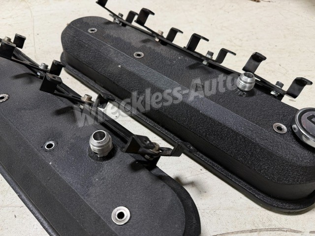 Pair of billet valve covers pulled from a 5.7 LS1, but will fit other LSx These are baffled, and have 10AN Male Fittings welded to them for easy catch can setup. The coil pack mounts are adjustable, so you can turn them 360 degrees or adjust the spacing on them. Powder coated Wrinkle black, and comes with brand new Felpro gaskets.