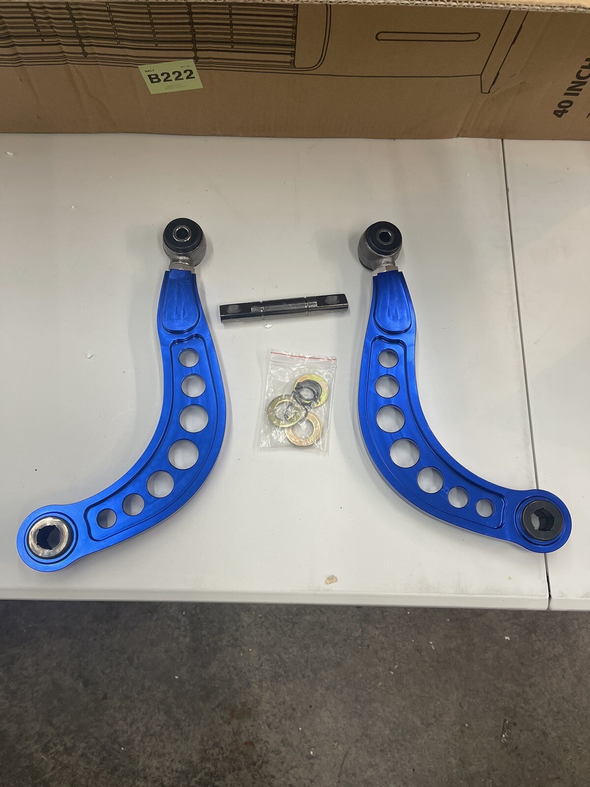 # Godspeed Adjustable Rear Camber Kit w/Control Arms Gen2-2006 - 2013 8th Honda Civic Dx/lx/ex/si All Fa1 / Fa5 / Fg1 / Fg2 / Fd2 / Fd5 (Blue) **(SEE Photographs this item is missing a pin)** - 06-13 Honda Civic (all models) / 06+ Acura CSX (all models) Rear Camber Kit (BLUE) - 06-13 Honda Civic (all models) / 06+ Acura CSX (all models) Rear Camber Kit (BLUE) Applications: 2006 2007 2008 2009 2010 2011 2012 2013 Honda Civic Coupe or Sedan (DX, LX, EX, SI) - This Godspeed Project camber kit replaces the OEM rear arm on the 06+ Honda Civic. It also will fit the Acura CSX-S. - 100% Completely bolt on - 40% stiffer then stock - 30% lighter but still stronger than stock arms (3/4" thick) - Improve cornering / handling by being able to have the correct camber - Polyurethane bushing - CNC billet 6061 aircraft aluminum -Works great for lowered cars / wider tires / wider wheels - Lowering a vehicle will often take it out of OEM alignment specification. A large majority of OEM suspension components do not have any camber adjustment. An out of spec alignment can cause poor handling characteristics and even premature uneven tire wear. Designed for the Honda Civic and the Acura CSX, this kit will help your lowered car not only drive better, but your tires will last much longer as well. Godspeed's Camber Kits are designed to be reliable for daily driving yet strong enough for high performance and race use. NOTE: Vehicle realignment is recommended after installation