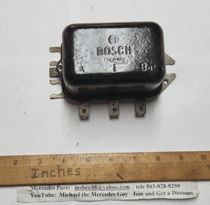 Good Bosch Voltage Regulator 1950-60’s Mercedes Ponton, Fintail, Coupe and Convertible This is in good condition and I guarantee it to work well. No burning of coils nor contacts. Sorry, no screws so use yours. I know how to pack and guarantee no damage in transit. I guarantee everything I sell, including all used electrical items. Check me out on youtube….Michael the Mercedes Guy