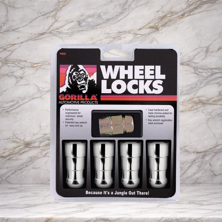 **New in Package – Gorilla Guard Wheel Locks (Part #66641)** This set includes premium Gorilla Guard wheel locks designed to provide enhanced wheel security and long-lasting durability. - **Thread Size:** 14mm x 1.50 (14x1.5) - **Seat Type:** Bulge Acorn with 60° conical seat - **Overall Length:** 2.20" - **Seat Width:** 0.89" at widest point - **Finish:** Chrome - **Construction:** Case-hardened steel with triple chrome plating The free-spinning guard design helps block removal tools, adding an extra layer of theft protection. Each set comes with **4 wheel locks and 1 unique dual-hex key**, compatible with **3/4" and 13/16" (19mm & 21mm)** lug wrenches. A **key registration card** is included for ordering replacement keys if needed. Gorilla Guard wheel locks are built on Gorilla Automotive’s long-standing reputation for quality and security. Featuring a distinctive external lock pattern, these locks cannot be removed without the matching key. Precision manufacturing and strict quality control ensure reliable performance and a durable chrome finish. Protect your wheels with confidence using Gorilla Wheel Locks — engineered for strength, security, and peace of mind.