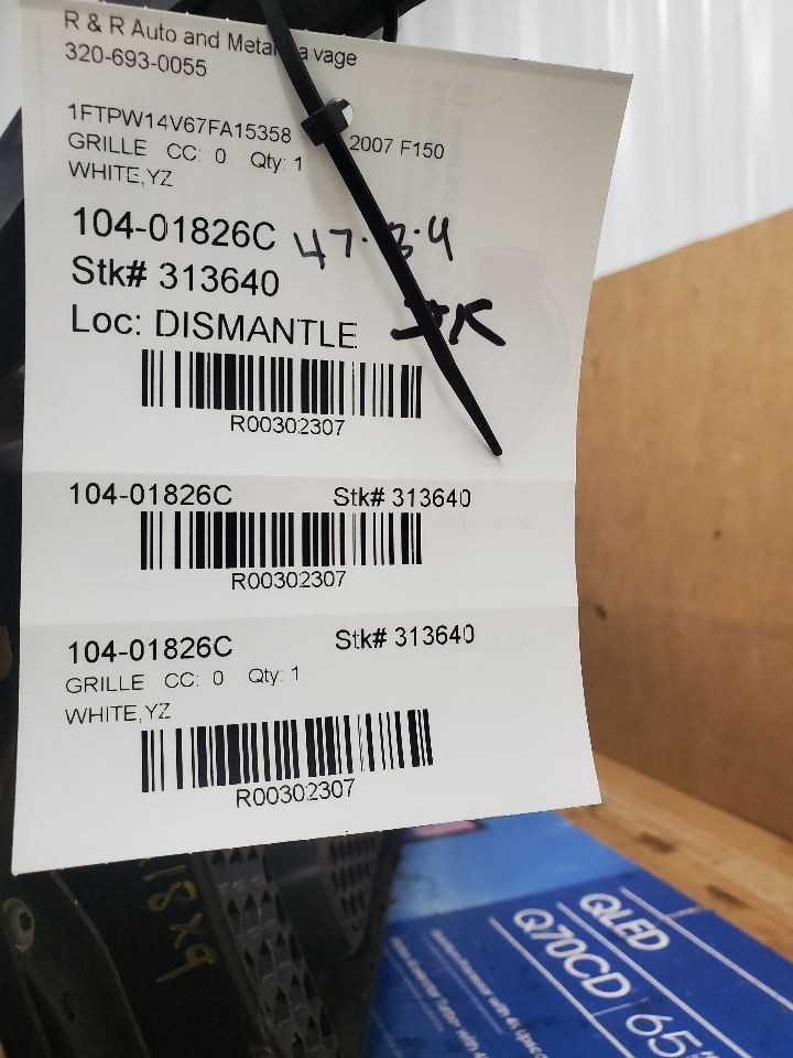 Description Donor Vehicle VIN: 1FTPW14V67FA15358 Model: F150 Year: 2007 Mileage: 127000 (0 = not available or unknown) Stock Number: 313640 Store Number: 1 Part Detail Part Grade: A Part Category: U Part Placement: Notes: WHITE,YZ This part will fit these makes and models with these options FORD F150 PICKUP 04 New Style, upper, painted surround, bar style center FORD F150 PICKUP 05 upper, painted surround, FX4 FORD F150 PICKUP 05 upper, painted surround, STX FORD F150 PICKUP 06 (upper), painted surround, FX4 FORD F150 PICKUP 06 (upper), painted surround, STX FORD F150 PICKUP 07-08 painted surround, FX4, (black H-bar style insert) FORD F150 PICKUP 07-08 painted surround, STX, (black H-bar style insert) WARRANTY / GUARANTEE SHIPPING NOTESABOUT USHELP **Core Charge.** Core is an acronym for ‘Cash On Return’. A core charge is sometimes applied to rebuildable parts such as engines or alternators that can be redeemed for a portion of their original price. If the part you are purchasing has a core charge applied, it will be noted in the description. **Parts Grading.** A standard code system is used to communicate the condition and quality of a part between automotive recyclers, automotive repair shops, and insurers. Knowing how these codes are used will help you understand whether the part meets your expectations before you buy it and what you can expect from the part when you receive it. A Grade\- The highest quality part. It is of low miles and/or exceptional condition for its age.B Grade\- The second level quality part. It is of average miles and normal condition for its age.C Grade\- The third level quality part. It has high miles and/or light damage.No Grade\- A part that has not yet been graded.