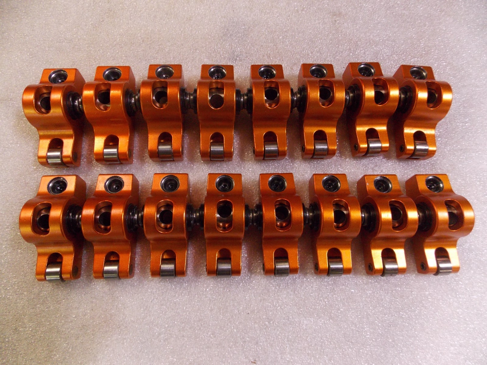 For sale is a set of 16 Harland Sharp 1001 small block Chevrolet roller rocker arms for a 3/8" stud mount and having a 1.5 rocker ratio. These have the polylocks with them. No grinding or visible damage anywhere. Nice set of low use rocker arms. Satisfaction guaranteed. Over $400 new. Thanks for looking and as always I combine shipping when possible.