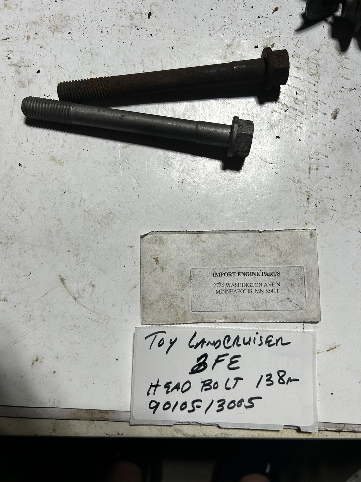 HEAD BOLT 138mm \*USED\* FITS TOYOTA LANDCRUISER 3FE 1990-1992 90105-13005 \*USED\* OE TOYOTA TOYOTA STATED FITMENT OF 1990-1992 ONLY??? CHECK SIZED AND COMPARE FOR 1988-1989 SPEC. ON BOLT IS 13X1.75X138m SHORTER BOLT IS 90910-02050 AT 120m \*\*\*SOLD AS EACH BOLT\*\*\* THESE ARE "OE" TOYOTA USED HEAD BOLTS, PLEASE MAKE SURE OF WHAT YOU NEED, THANKS ALSO HAVE ROCKER ARMS 13811-61030 FITS CYL'S 1-3-5 ALSO HAVE ROCKER ARM 13812-61030 FITS CYL'S 2-4-6 ALSO HAVE EXHAUST RETAINERS 13741-61010 INTAKE RETAINERS 13741-60030 ALSO HAVE LIFTERS 13751-61020 EVERY PART I HAVE LISTED ON MY E-BAY SITE IS ON MY SHELF, NO DROP SHIPS FROM VENDORS. NOTE THAT I USE "ITM" FOR MY CATALOGING, NOT ALL PARTS SHIPPED WILL BE ITM'S PLEASE CHECK CATALOG FOR CORRECT FITMENT, QUESTIONS? CALL ME