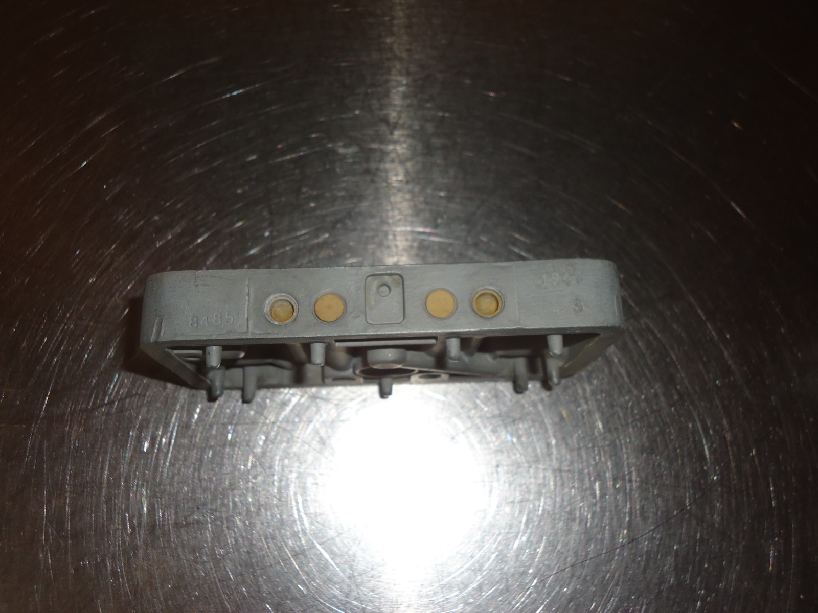 Holley carburetor metering block. Block has number 1947 8485 stamped in it. Metering block has power valve provision and idle circuits. Accelerator pump passage is open. Block was removed from a core carburetor. It is dirty and shows some patina from use and sitting. See pics for condition. Can not be returned if installed, ran or has been modified. Must be returned in the same condition as shown.