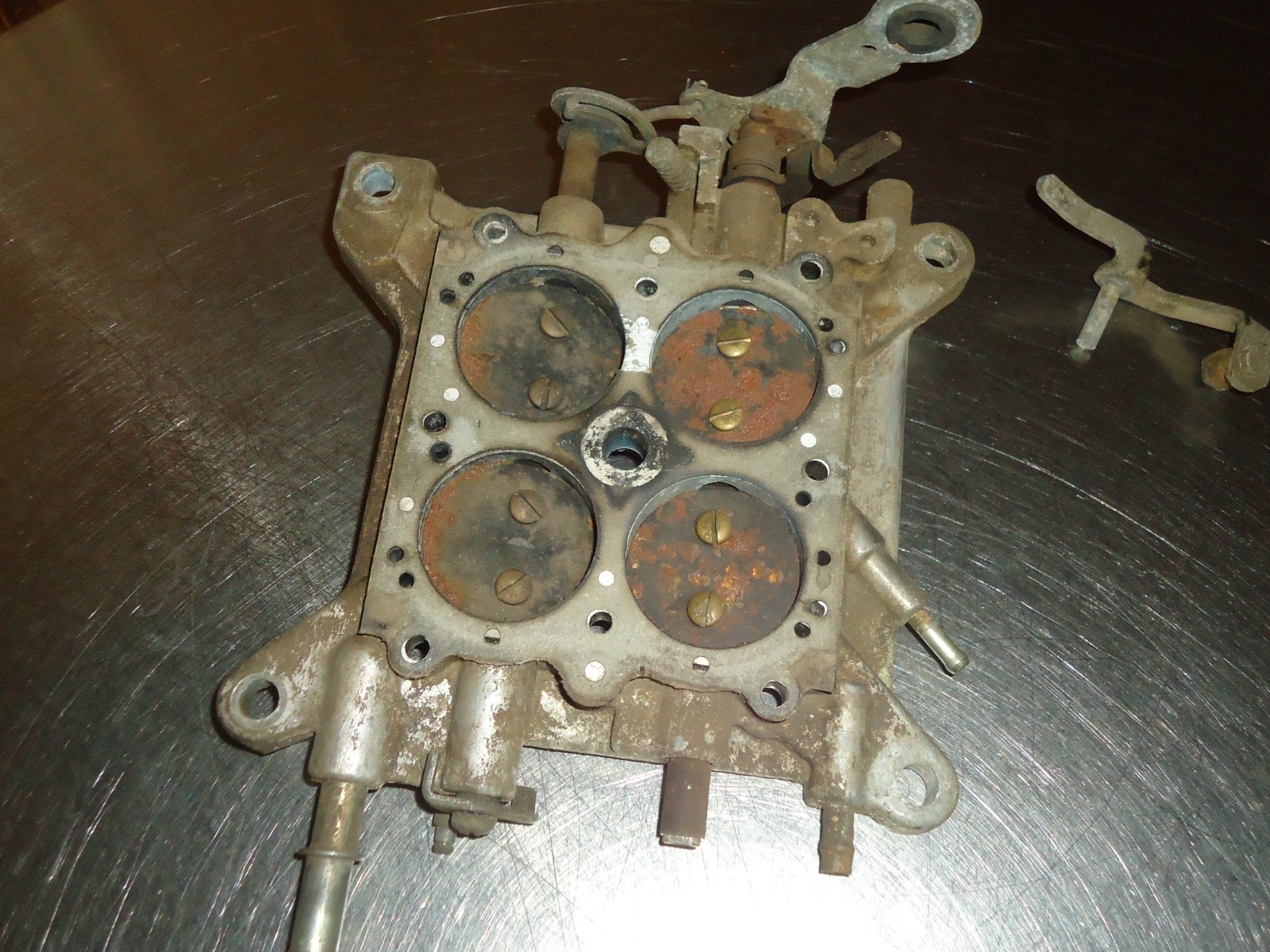 Holley 4-barrel carburetor base plate, removed from a 3367 core. Comes with early stud style accelerator pump arm. Base is dirty and shows some patina from use and sitting. See pics for condition. Can not be returned if installed, ran or has been taken apart. Must be returned in the same condition as shown.