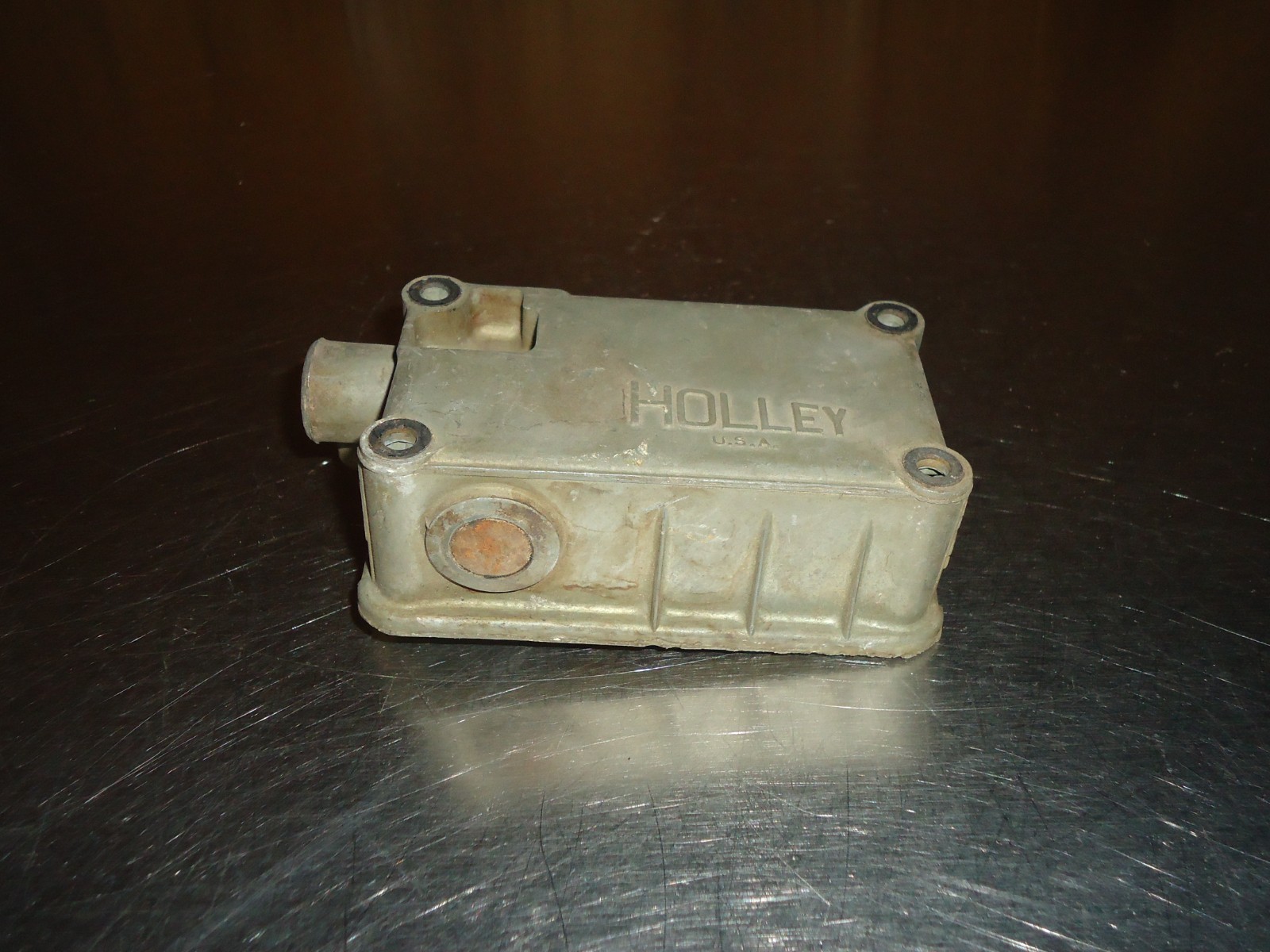 Holley side hung fuel bowl for vacuum secondary 4-barrel carburetors. Removed from a core carb. It is dirty and shows some patina from use and sitting. See pics for condition. Can not be returned if installed, ran or has been taken apart. Must be returned in the same condition as shown.