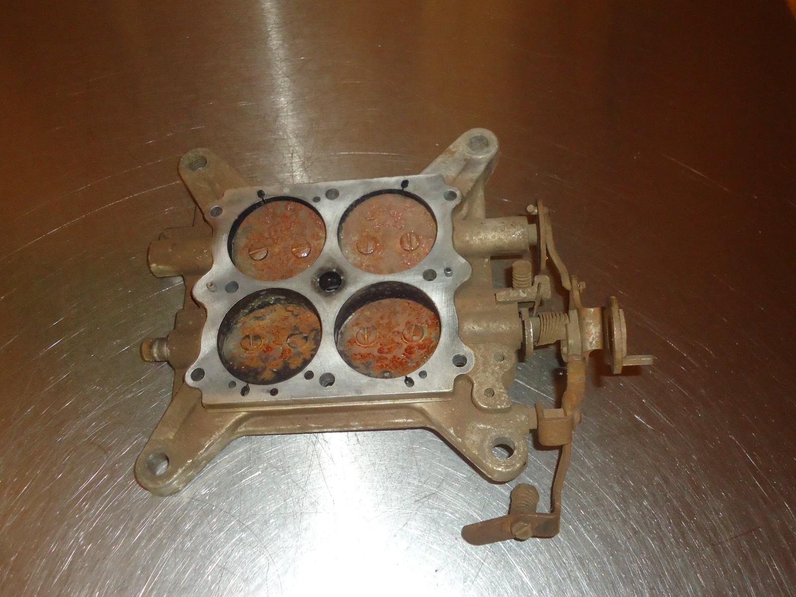 Holley vacuum secondary 4-barrel carburetor carb base plate. Casting number 12r-2916b. Base is dirty and shows some patina from use and sitting. Throttle arm wiggles on shaft. See pics for condition. Can not be returned if installed, ran or has been taken apart. Must be returned in the same condition as shown.