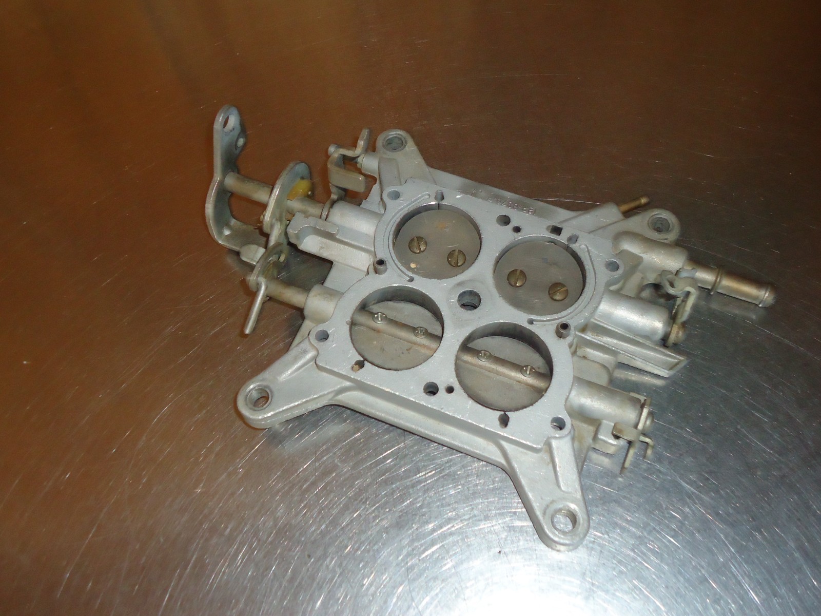 Holley vacuum secondary 4-barrel carburetor base plate. Base has casting number 12r-3876B. Throttle bores measure 1-9/16". Linkage moves free. Base is dirty and shows some patina from use and sitting. See pics for condition. Can not be returned if installed, ran or has been taken apart. Must be returned in the same condition as shown.