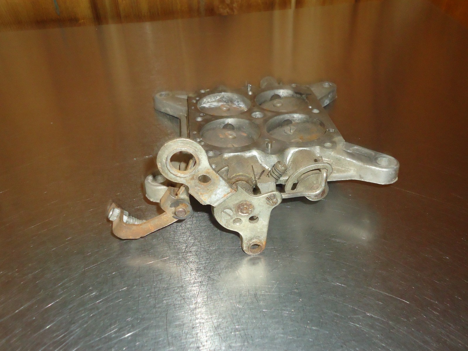 Holley vacuum secondary 4-barrel carburetor carb base plate. Casting number 12r-4233b. Base is dirty and shows some patina from use and sitting. See pics for condition. Can not be returned if installed, ran or has been taken apart. Must be returned in the same condition as shown.