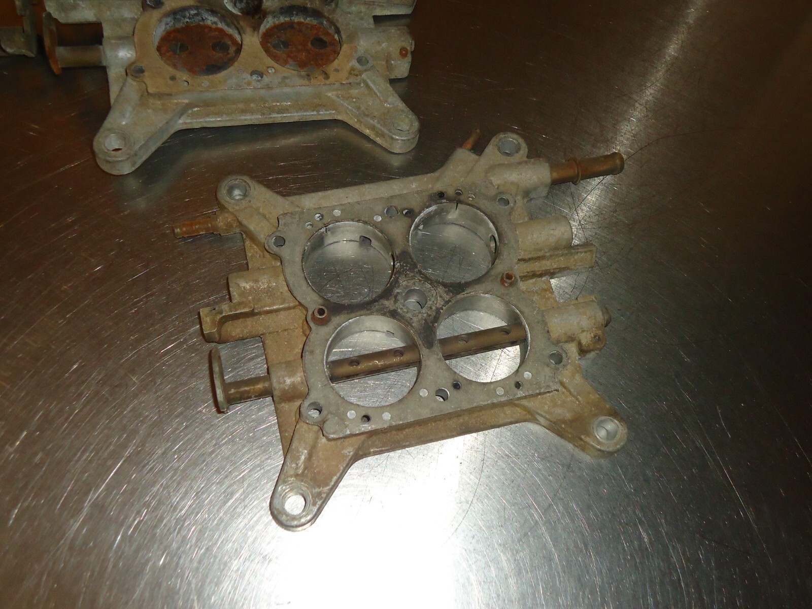 Holley 4-barrel carburetor base plate for Mopar 4160 vacuum secondary carb. Lot is for (2) baseplates. Both are not cracked. One is bare and the other is froze tight from sitting. See pics for condition. Can not be returned if installed, ran or has been taken apart. Must be returned in the same condition as shown.