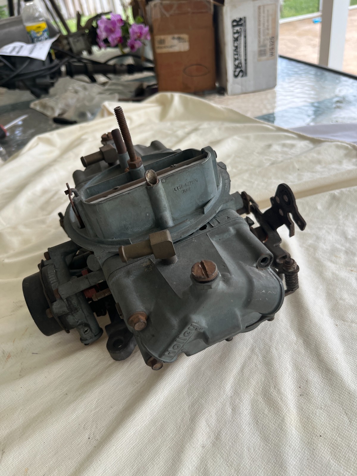 Holley Carb Carburetor 750 CFM List 4779-5 Double Pumper Electric Choke. Been on the shelf for years. Will need a rebuild. Has a fitting on the top of each bowl that I don't know what it's for(looks custom).