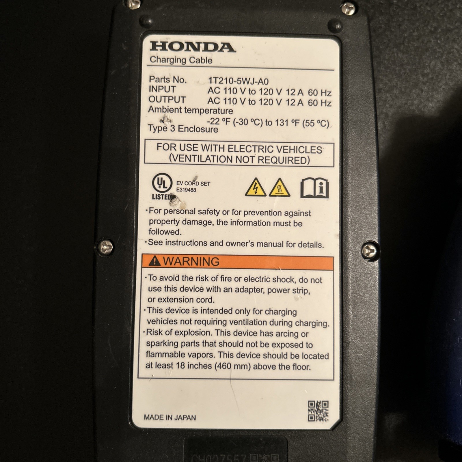 The Honda Genuine EV/ Plug-in Hybrid Charging Cable (1T210-5WJ-A0) is a reliable and high-quality charging solution for electric and plug-in hybrid vehicles. With a 120V compatibility, this cable is designed specifically for Honda vehicles to charge at home from a standard 3 prong US plug. This charger was used on a 2018 Honda Clarity.