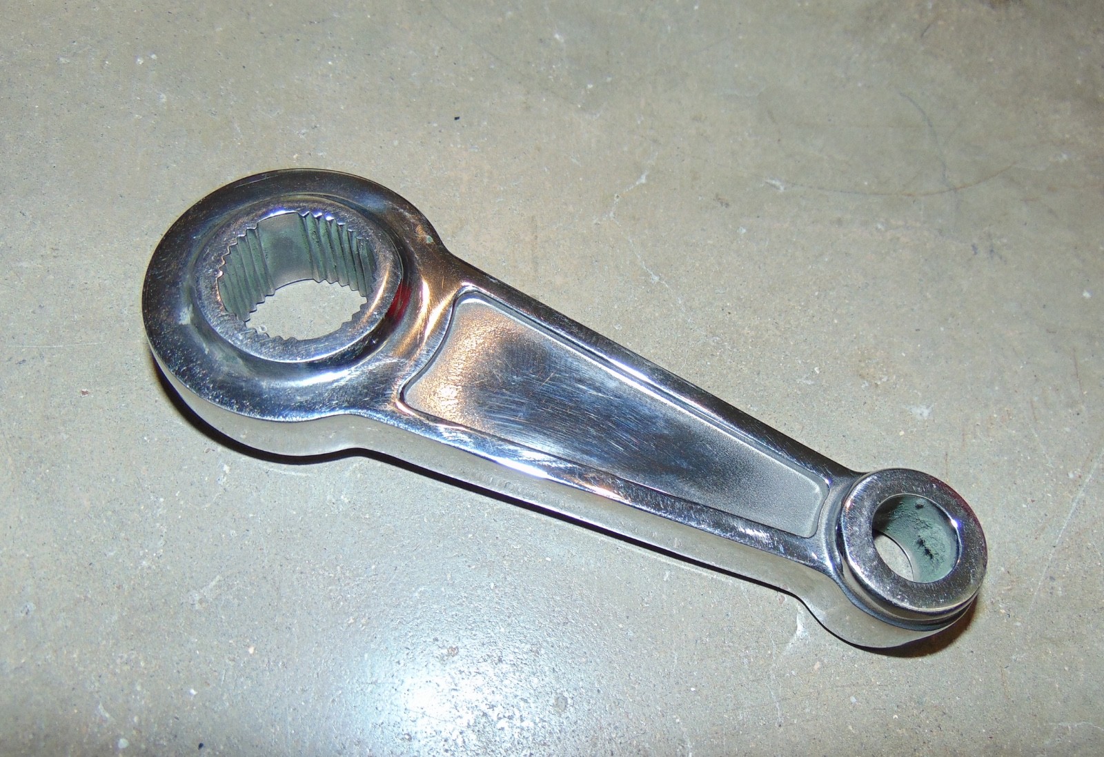 **Hotrod Polished Stainless Steel Pitman Steering Arm 6" End To End Deuce Factory?** This is a polished Stainless Steel steering arm. I got this with a bunch of polished Deuce Factory front end parts and I think this was identical to one that was in a Deuce Factory package. It is about 6" long overall and about 4 1/4" center to center on the holes. I think the splined end may be for a GM steering box. It is unused, but has some light rub marks that will easily polish off. **I am going to be listing a lot of vintage hotrod and automotive parts as well as the aviation items that I normally sell. If you'd like to look specifically at one or the other you can click on the store icon and then select either category to see only those items. There may be a few items that are listed in both categories. be sure to check out my other listings because I have all kinds of interesting items.** I will ship items by either FEDEX ground or USPS which ever is cheaper and I will combine multiple items to save shipping. I only charge actual postage as close as I can figure it without losing money. I don't charge any handling or packing fees.