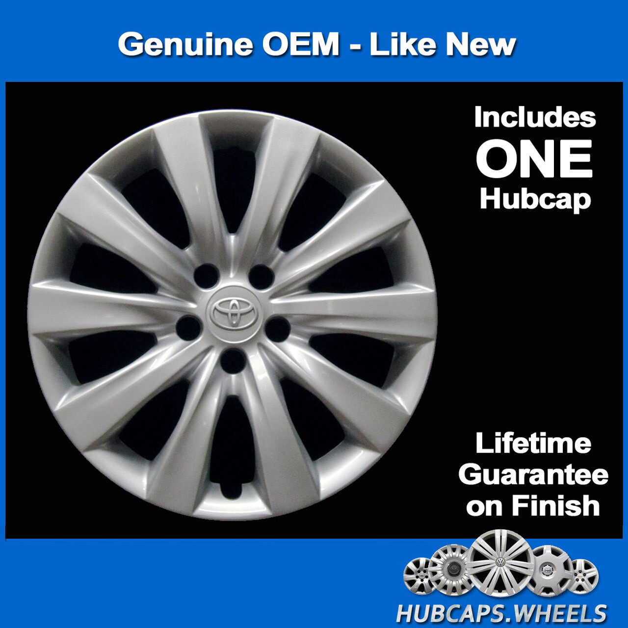 Toyota Corolla 2011-2013 Hubcap - Genuine Factory OEM 61159 Wheel Cover Price is for ONE hubcap. Factory-original Toyota Corolla 16" hubcap. Fits Toyota Corolla 2011, 2012, 2013. This is the same hubcap that originally came with the vehicle. Our Professionally Reconditioned wheel covers are reconditioned in-house, which is why we can offer you a lifetime guarantee on your hubcap's finish.  Hubcap for Toyota Corolla 2011-2013 Genuine Factory OEM 16-in Wheel Cover 61159 -  _Professional Cleaning and Reconditioning_ * * * ### **Lifetime Guarantee on Like-New Finish!** None of the hubcaps we sell are cracked, broken, or missing pieces. We have a professional refinishing process using commercial equipment, just like a body shop. We are so confident in our process perfected over 20 years of experience, we offer a **LIFETIME GUARANTEE** that the hubcap we sell you will never fade or peel! * * * #### FREE SHIPPING! ##### **All Items are In Stock and Leave Our South Carolina Warehouse Within 1 Business Day** Before submitting your order, please double-check that your “ship to” address is correct. If additional shipping charges are incurred by hubcaps.wheels as a result of an error you make with your address, we'll need to pass that exact cost on to you. Because UPS will not deliver to a PO Box, in some cases, we may ask you to provide a physical address. If merchandise is not received within 14 business days, please notify us in case the package was lost in transit. Any orders refused at time of delivery will be refunded less the shipping charges incurred to your address and the shipping charges incurred back to our facility. ##### 30-DAY RETURN PERIOD All returns must be made within 30 days from the date of original delivery to you. ##### SAME CONDITION AS YOU RECEIVED IT Returned items must be in the same condition that you received it. If you used it on your vehicle or caused any damage to it, we cannot accept a return. ##### RETURN PACKAGING To ensure a quick refund, include a copy of the packing slip that was in the original package; or print the email receipt we sent you. **Be sure to always put the hubcaps back in the plastic bags they came in and always use the cardboard separators. If you do not package with the bags and cardboard, any shipping damage will be your responsibility.** ##### RETURN SHIPPING Cost of return shipping is your responsibility. Please feel free to send via USPS, UPS, or FedEx, whichever is most convenient for you. We strongly recommend that you send with a tracking number in case your returned item becomes lost or damaged before it reaches us. ##### **ABOUT OUR COMPANY** Since 1999, we're one of the only automotive parts companies in the USA that offers professional-grade reconditioning and refinishing of OEM hubcaps. This means you can purchase the **same quality and BIG savings over dealer prices**. We also offer budget-oriented brand new replica hubcaps and sets that are better quality than cheap, brittle sets available from many other sellers.