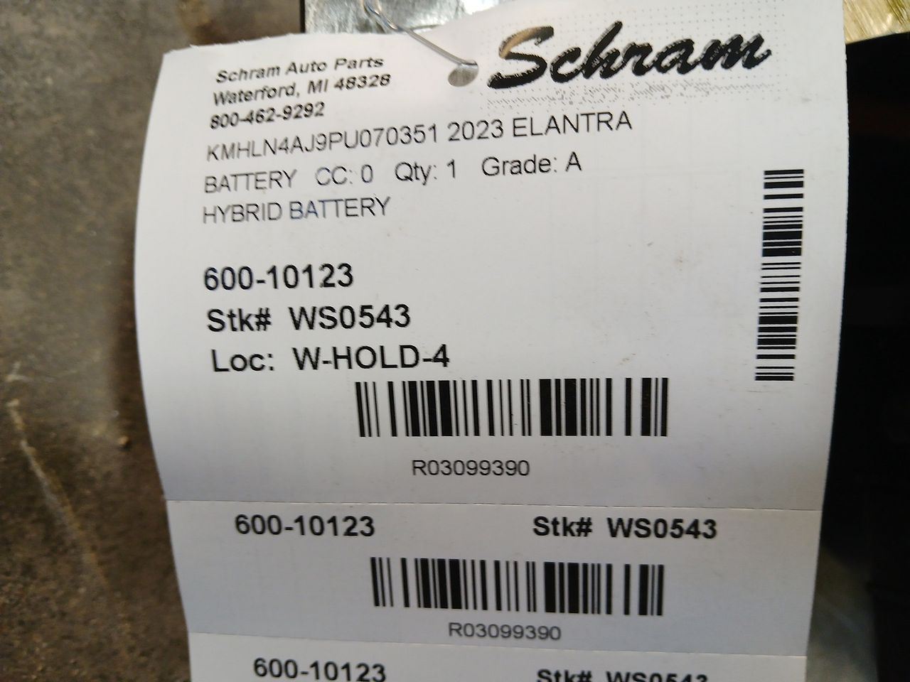 1923   Description HYBRID BATTERY Mileage: 19000 This item will fit the following vehicles/applications: ELANTRA 21-23 (hybrid vehicle) **Original Equipment Hybrid Battery** **Schram Auto Parts - Hybrid Battery** **Fitment: Please Confirm Before Purchase** This listing is for a **Hybrid Battery**. These batteries will include what is shown in the images unless otherwise noted in the 'Conditions and Options'. Fitment is the responsibility of the buyer. We will do our best to advertise fitments. Please use the part number, pictures, and description provided to make sure this part fits your vehicle. **Shipping Information** This item may be shipped via freight truck. It's crucial that the receiver inspects the item thoroughly **before** signing for it. Inspecting the item upon delivery is necessary to uphold any shipping insurance. Please keep this in mind when scheduling and receiving the delivery. **Additional Programming and Parts May Be Required** If you are buying an item that is not a direct replacement for your existing system, please be aware that additional parts may be required. In such cases, we recommend contacting your dealer for assistance. Please also consider that this item **MAY NEED TO BE REPROGRAMMED OR UNLOCKED**, so take this into account before making your purchase. **Got Questions? Contact Us!** If you have any questions or need further information, please don't hesitate to ask us. We're here to assist you with your inquiries regarding this Hybrid Battery or any other automotive needs. Choose Schram Auto Parts for your automotive requirements, offering top-quality parts and outstanding service since 1923. Vehicle 2023 ELANTRA Mileage 19000 Part Grade A What's this?