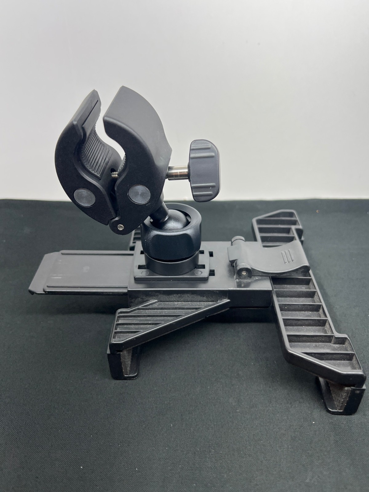 Designed for secure installation and versatile use, this professional-grade mounting kit ensures stability for mobile devices in various settings. • Durable black finish for long-lasting use • Adjustable arms and clamps for customization • Includes multiple components for varied mounting needs • Professional-grade build for reliability Package shows creases and minor tears, does not impact product integrity. Handle to holder is 19.5 inches Brackets are 6 inches wide and extends from 7 in to 9 inches Clamps are 4.5 x 1.5 wide