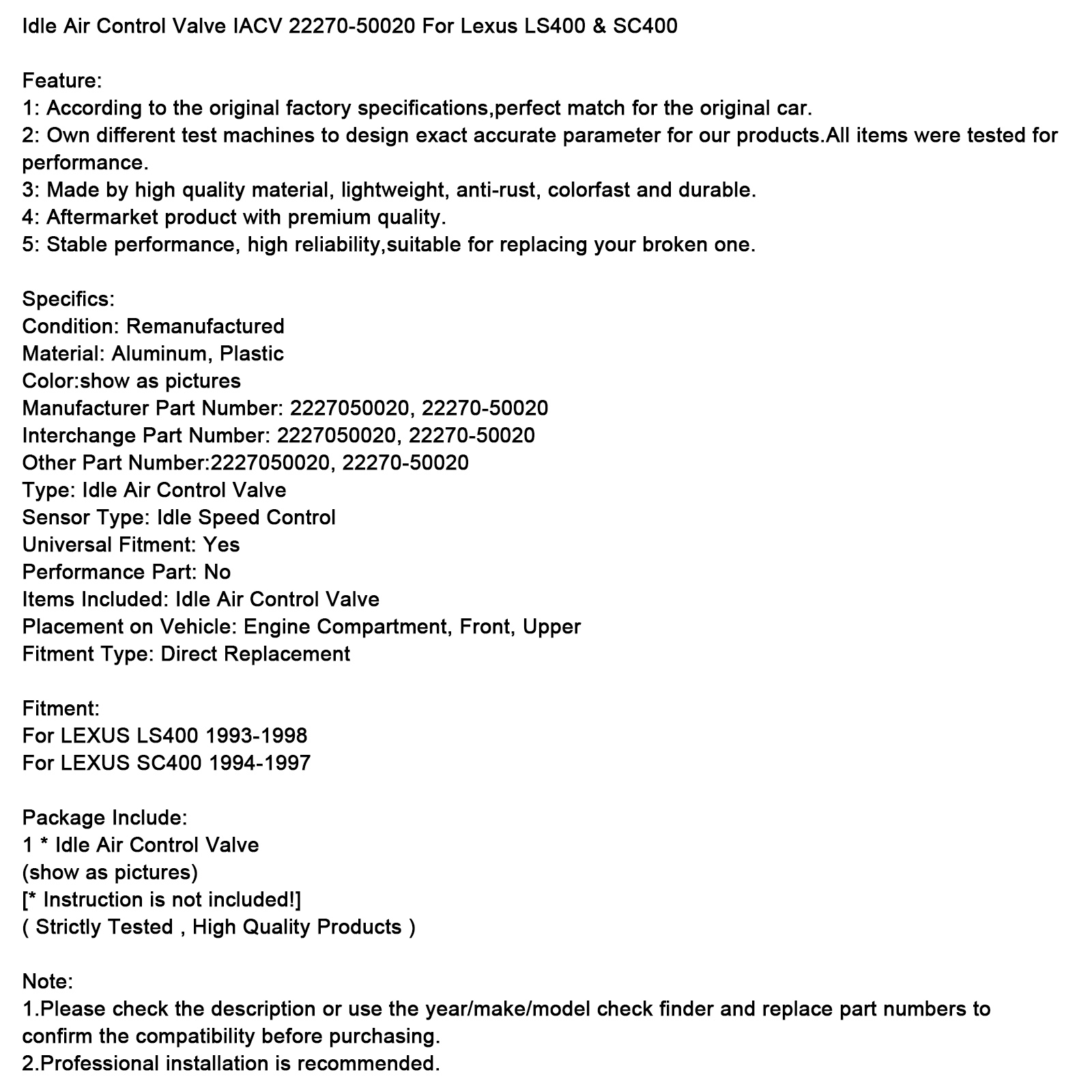 -  -  -  -  -  -  -  -  -  -  -  -  -  -  -  -  -  -  -  -  -  -  Product Description Please kindly note: This item is **Refurbished Parts**, not Brand New. To ensure compatibility, we recommend providing your ①VIN, ②OE Number, ③The clear photo of your original part if possible. Auto parts are highly complex, and this information helps us confirm the correct fit. Thank you so much! Idle Air Control Valve IACV 22270-50020 For Lexus LS400 & SC400 Feature: 1: According to the original factory specifications,perfect match for the original car. 2: Own different test machines to design exact accurate parameter for our products.All items were tested for performance. 3: Made by high quality material, lightweight, anti-rust, colorfast and durable. 4: Aftermarket product with premium quality. 5: Stable performance, high reliability,suitable for replacing your broken one. Specifics: Condition: Remanufactured Material: Aluminum, Plastic Color:show as pictures Manufacturer Part Number: 2227050020, 22270-50020 Interchange Part Number: 2227050020, 22270-50020 Other Part Number:2227050020, 22270-50020 Type: Idle Air Control Valve Sensor Type:Idle Speed Control Universal Fitment:Yes Performance Part:No Items Included:Idle Air Control Valve Placement on Vehicle:Engine Compartment, Front, Upper Fitment Type: Direct Replacement Fitment: For LEXUS LS400 1993-1998 For LEXUS SC400 1994-1997 Package Include: 1 \* Idle Air Control Valve (show as pictures) \[\\* Instruction is not included!\] (Strictly Tested , High Quality Products) Note: 1.Please check the description or use the year/make/model check finder and replace part numbers to confirm the compatibility before purchasing. 2.Professional installation is recommended. - SHIPPING&RETURNS - WARRANTY - ABOUT US ♦Please note that your item will typically be dispatched **within 5 business days** after payment confirmation. We have **multiple warehouses** across the United States, so the parcel will be shipped from the warehouse with the available stock, **not only from our LA/Chino location**. ♦Delivery usually takes **5-12 business days**, depending on your delivery address and any potential shipping delays due to unforeseen circumstances. ♦ **If for any reason, you are not satisfied with your purchase and would like to initiate a return, please contact us first. We will provide you with the return instructions to ensure the process is as smooth and cost-effective as possible.** ♦We strive to offer the best service and aim to save you both time and money. Thank you for choosing us! ♦ **60 Day Money Back Guarantee** ♦The warranty does not extend to normal wear and tear of products; products damaged due to environmental conditions including rain, snow, hail, salt, or natural disasters; products damaged due to accident or collision; or product damage caused by other faulty parts. ♦All items must be in their original condition and must not be damaged due to incorrect installation upon return. Products damaged as a result of abuse, misuse, improper repairs or maintenance, improper installation, alteration, or modification will not be covered by the warranty. ♦We need buyer's detailed description of failure to find out the cause, we may also ask for photos or videos, pls understand. ♦Under NO circumstances will our liability exceed the amount of the original sale. ♦We must be notified of the intent to return your item within **30 days** of receiving the item. ♦EACH WARRANTY DOES NOT COVER ANY LABOR COSTS OR INCIDENTAL, INDIRECT, SPECIAL OR CONSEQUENTIAL DAMAGES SUCH AS, BUT NOT LIMITED TO, PHYSICAL INJURIES OR PROPERTY DAMAGE, LOSS OF TIME, LOSS OF USE OF THE VEHICLE, INCONVENIENCE, AIR FREIGHT CHARGES, RENTAL VEHICLE CHARGES, TOWING CHARGES OR ACCOMMODATIONS RESULTING FROM A DEFECT IN OR FAILURE OF THE PART. **MadHornets** has given our customers the best Auto parts, Motorcycle parts available on the market. We do it all, from motorcycle, cars and trucks to SUVs and more. Basically, if it’s on wheels and you need it, we can handle it. With our extensive knowledge and experience in this industry, we continue to bring you the best auto, motorcycle parts. We have more than 20,000 square meters of self-owned or third-party warehousing and logistics bases in the United States, the United Kingdom, Australia and other countries, and have a complete supply chain system to deliver high-quality products from all over the world to consumers. We are also committed to the development of Electronics, Home Garden, Stage Lights and other categories. MadHornets continues to bring you superior quality and cost effective products. We always stand behind our products by our Money Back Guarantee and Manufacturer Warranty. Don't hesitate, add this store to you favorites SHIPPING&RETURNS ♦Please note that your item will typically be dispatched **within 5 business days** after payment confirmation. We have **multiple warehouses** across the United States, so the parcel will be shipped from the warehouse with the available stock, **not only from our LA/Chino location**. ♦Delivery usually takes **5-12 business days**, depending on your delivery address and any potential shipping delays due to unforeseen circumstances. ♦ **If for any reason, you are not satisfied with your purchase and would like to initiate a return, please contact us first. We will provide you with the return instructions to ensure the process is as smooth and cost-effective as possible.** ♦We strive to offer the best service and aim to save you both time and money. Thank you for choosing us! WARRANTY ♦ **60 Day Money Back Guarantee** ♦The warranty does not extend to normal wear and tear of products; products damaged due to environmental conditions including rain, snow, hail, salt, or natural disasters; products damaged due to accident or collision; or product damage caused by other faulty parts. ♦All items must be in their original condition and must not be damaged due to incorre