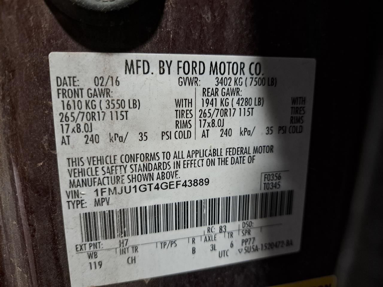- VIN #: 1FMJU1GT4GEF43889