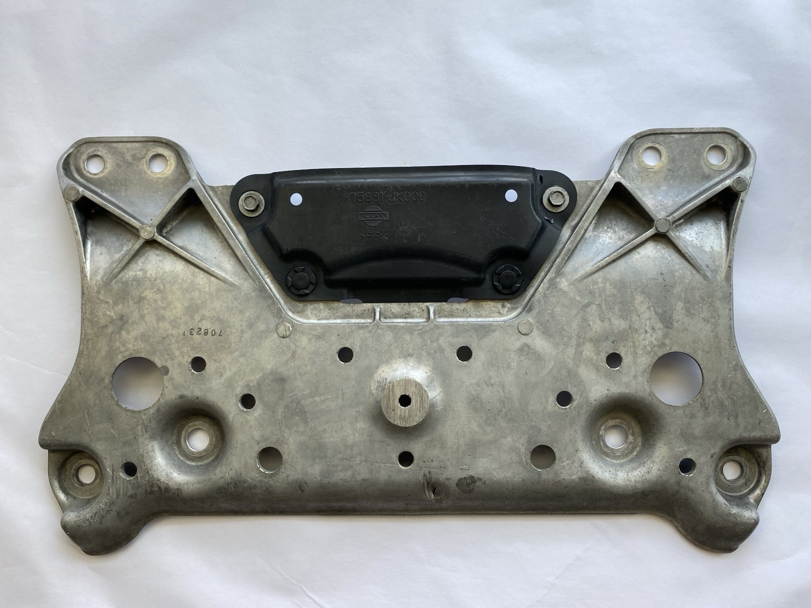 Description: OEM Infiniti G35 / G37 / G25 / EX35 Front Engine Splash Guard Skid Plate Bracket – Part Number 75881JK000. This is a genuine Nissan/Infiniti aluminum bracket with attached plastic cover. Condition: • Used OEM part • Shows normal signs of wear from use • Has a visible crack/damage in one area (see close-up photo with orange circle/arrow) • Please review all photos carefully for exact condition before purchase