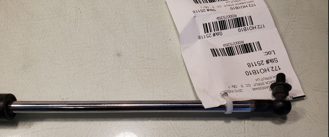 Description Donor Vehicle VIN: JHMZE2H50AS038448 Model: INSIGHT Year: 2010 Mileage: 0 (0 = not available or unknown) Stock Number: 25118 Store Number: 1 Part Detail Part Grade: A Part Category: U Part Placement: Notes: HATCH STRUT LH This part will fit these makes and models with these options WARRANTY / GUARANTEE **Return Policy** All parts we sell come with a **60 Day Money Back Guarantee** unless otherwise stated. The 60 day period starts when you take possession of the part. We do not cover the cost of labor charges during the installation of your parts. All original shipping costs are non-refundable. **Standard Warranty** We offer a standard warranty on all mechanical parts. This covers the part only, no labor charges to install the part. We are not responsible for any improper installation or misdiagnosis. SHIPPING NOTESABOUT USHELP **All Toyota and Ford Inc.** ships to US addresses within the continental 48 states. **Shipping to Alaska, Hawaii, Puerto Rico, APO, FPO or PO Box addresses** is available for select parts only. **Local Pick-up at our facilities is available.** Please contact us prior to your purchase to arrange local pick-up. Buyer must select 'Buy It Now' prior to local pick-up. **Please contact us prior to purchasing this part** if you have any questions regarding our business policies, the warranties or guaranties we offer or the fitment of this part with your vehicle. **Parts Grading.** A standard code system is used to communicate the condition and quality of a part between automotive recyclers, automotive repair shops, and insurers. Knowing how these codes are used will help you understand whether the part meets your expectations before you buy it and what you can expect from the part when you receive it. **A Grade** \- The highest quality part. It is of low miles and/or exceptional condition for its age. **B Grade** \- The second level quality part. It is of average miles and normal condition for its age. **C Grade** \- The third level quality part. It has high miles and/or light damage. **No Grade** \- A part that has not yet been graded.