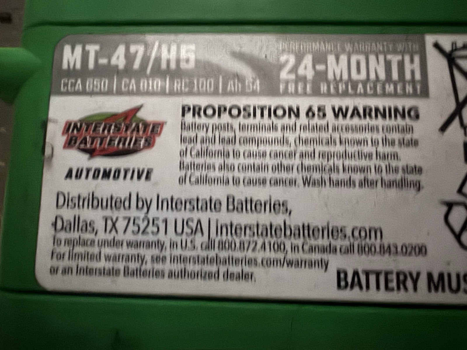 Interstate MT-47/H5 Battery 650ccas 3/25 Sticker
