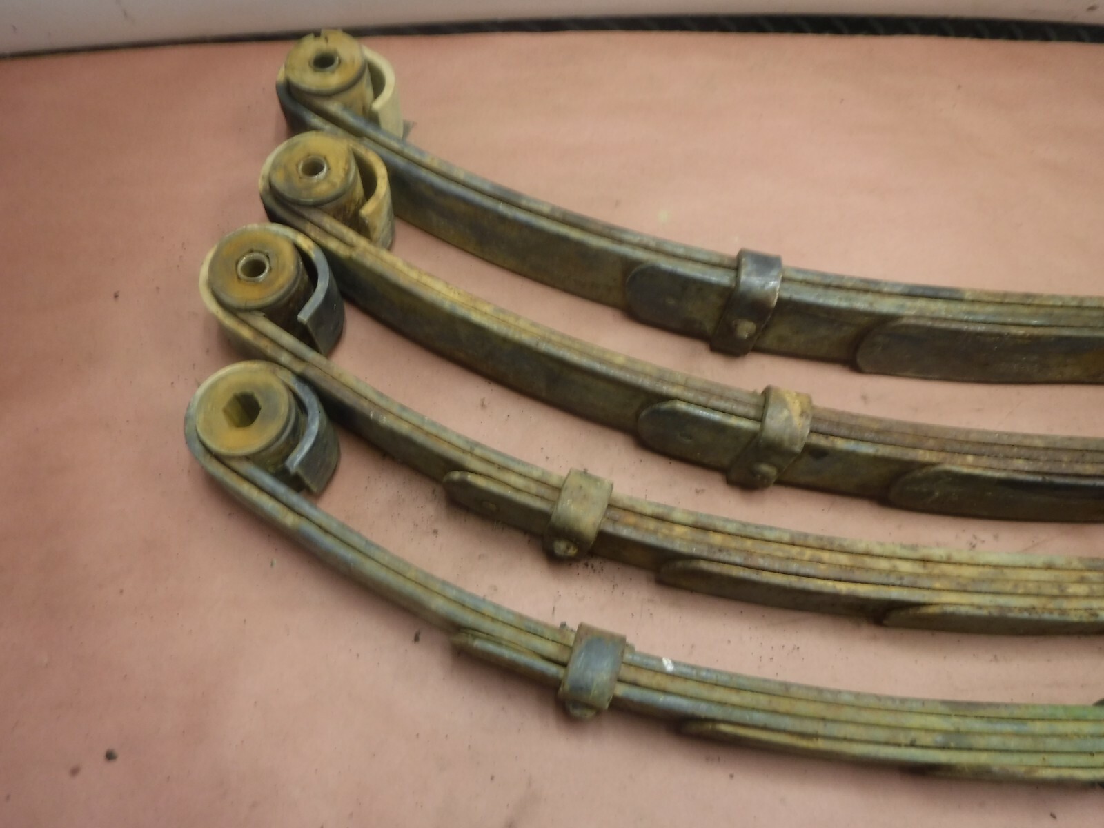 Jeep Wrangler YJ 87-95 Front and Rear lift leaf springs, these are in fair shape, we do NOT know the brand or height, the bushings on some may need replaced, they have cuts/ wear on them, some sleeves missing, if you take a straight edge and run it between the eyes, and measure the depth the fronts measure 10" from top to bottom of spring, the rears are 9.5" top to bottom of the springs, sold as shown.