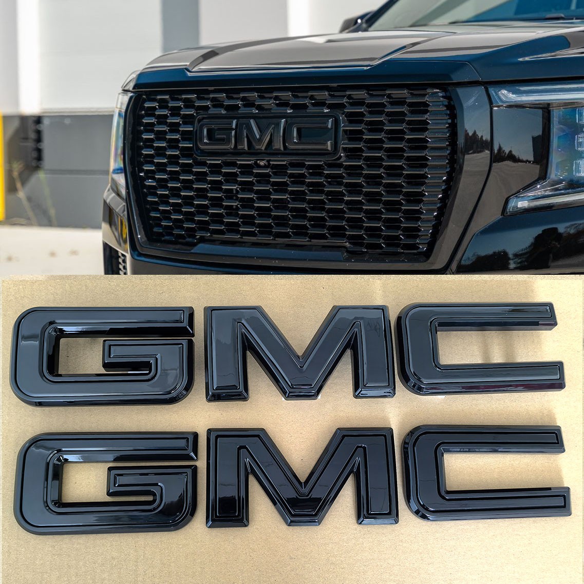 **Set OEM Sierra Front Grille and Rear Tailgate Emblems made for :** - **2019-2025 GMC Sierra 1500 (NOT FOR 2019 LIMITED)** - **2020-2025 GMC Sierra 2500HD** - **2020-2025 GMC Sierra 3500HD** Features: 1.100% brand 3D new and High quality. 2\. This is Real 3D emblem and NOT just a thin stickers, Not overlay emblem, 3.Easy to install to your grill and Tailgate,if you have any problem,please ask us for helping. Color: As the first picture.All gloss Black The Grille and Tailtate are the same size,Whole Emblem Size: About 18" long \*3 1/4" tall Individual letters G:5 3/5"\*3 1/4" M:6 1/4"\*3 1/4" C:5 3/5"\*3 1/4" Package Include: You can get it as the first picture.