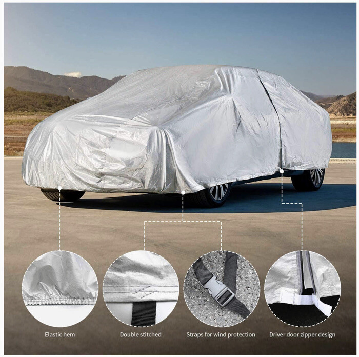 Large Car Cover Dust Sun UV Protection Waterproof For Sedan Coupe Convertible. Features & details UNIVERSAL FIT FULL EXTERIOR CAR COVER -- Length is 200". Outdoor/indoor car cover is the ideal size for 190''—200” sedans. The CAR DRESS car cover provides comprehensive protection against the elements. The sturdy material is scratch-resistant, anti-tear as well holds its shape, even after years of repeated use! PREMIUM MATERIAL SEDAN COVER -- Crafted from high quality Non-woven+PEVA+Aluminium film+UV+Cotton. Silvery surface car cover can effectively block the sun's UV rays on the surface and interior of the car, effectively reduce the temperature inside the car in the summer. The cover also waterproof, dust proof, the soft cotton lining protect your car from scratch, perfect for indoor and outdoor use. DRIVER DOOR ZIPPER FOR EASY ACCESS -- When you put the cover on the car and then find that some important items are in the car, the driver door zipper will provide convenience for you. ♥ Comes with a free storage bag so you can easily store your cover when not using, easy to carry around. WINDPROOF -- The front and rear elastic hem is fit for your vehicle. Grommets and two straps for wind protection. This cover will stay in place, even during extreme weather. QUICK CLEANING -- Get rid of the dirt, gunk, and grime in no time! Wipe down the car cover with a damp cloth and the mess will slide right off.