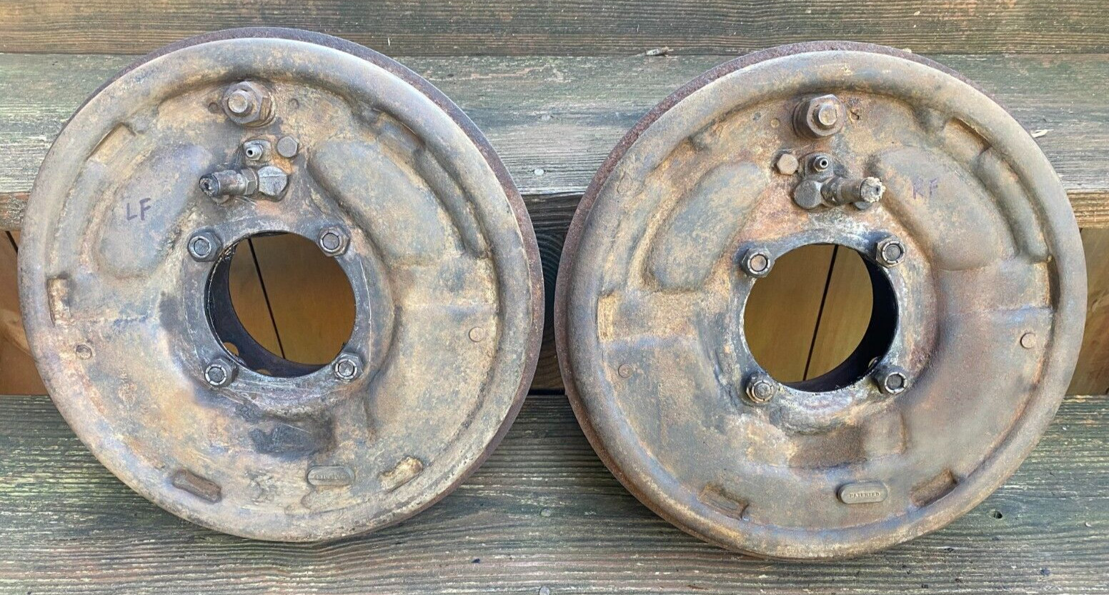 Late 1951-1952 Ford F-2 F-3 Front Brakes w/Backing Plates Drums & Hardware - OEM - Removed from a later 1951 Ford F3. - Uni-Servo Single Anchor type. - All components are used. - All components need to be restored. - OEM drums have wear. - Please look at photos carefully. - Please ask questions first. - FedEx 16x16x12 60lbs