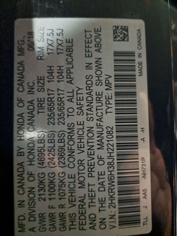 - VIN #: 2HKRW6H38JH221082