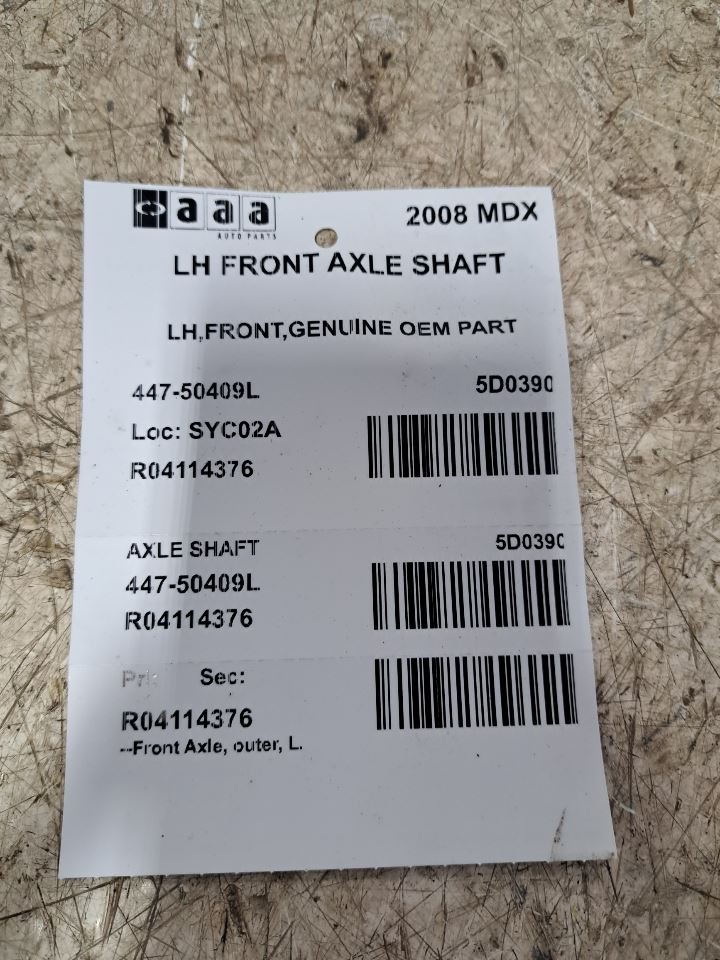 Item Description **6 MONTH WARRANTY!! 60 DAY NO HASSLE RETURNS!!** **This for a USED OEM Axle/Cv C/V Shaft Assembly pulled from a 2008 MDX with 167000 actual miles on it.** **Here are our part notes about this specific part:** **LH,FRONT,GENUINE OEM PART** **Our Part #: 447-50409L, 4114376** **Our Stock#: 5D0390** Please see the fitment section below to make sure this will fit your vehicle. Pay special attention to any options listed!!! In some cases, it may only fit vehicle with certain options or specific ID#s as listed below. **MDX 07-09 Front Axle; outer, L.** Whats Included? Whats Included? FAQ/ Help Shipping Payment Returns/Warranty #### Whats Included? ``` Here is a short description of what will generally be included with your item. If you would like more information or are unsure if something will come with your item, PLEASE ASK!! A/C Compressor: Includes the clutch/pulley assembly A/C Condenser: Sensors and hoses are not included ABS Units: Include the ATTACHED electronic module unless otherwise noted Alternator: Includes the pulley. Any brackets are not included Axle/CV shaft: Does not include the axle nut Blower Motor: Include the squirrel cage/fan blade Caliper: Includes the bracket and slides. Slides are not covered under warranty Column Switch: Includes wiring (if applicable) up to the first point it can be unplugged Control Arm: Includes the ball joint and any bushings Coolant Overflow Bottle: Cap is included Cowl Vent Panel: See Our Part notes, often sold as one side only Differential Carrier: Does not include axles Door Trim Panel: Includes handle and armrest. Does not include window/lock switches Engine: Included for convenience unless otherwise noted. These parts are not covered under warranty: Intake manifold, fuel injectors, oil pan, sensors, water pump Not included: Throttle body, Turbo, wiring harness exhaust manifold (may be left on in certain cases) Exhaust Manifold: Does not include turbo where applicable Fan Assembly: Includes motors, shroud, and blades. Fuel injectors: See our part notes Fuel Filler Door: Includes hinge. Does not include bolts/hardware Fuel Pump: Includes sending unit and any molded hoses that are non-removable Headlight: Brackets are included unless otherwise noted. HID headlights include the bulbs and ballast Hub: Includes wheel studs Ignition Coil(s): See part notes Interior Rear View Mirror: Does not included bracket glued to windshield Jack: See part notes. If noted as assembly, it will include the lug wrench Mass Airflow Sensor: Does not include housing unless pictured Power Steering Pump: Includes pulley and ATTACHED reservoir. Remote reservoirs and brackets will not be included Power Steering Gear: Includes pitman arm Rack and Pinion: Includes tie rods but they are not covered under warranty Radio: Pay special attention to our fitment description. Often times radios are more than one piece and we sell them each separately Spindle/Knuckle: Does not include hub unless noted Starter: Includes solenoid Strut: Struts are left assembled and include top plate, spring, and dust boot (dust boots on used struts are rarely in perfect shape) Stabilizer Bar: Does not include links or bushings Sunvisor: Does not include clip Taillight: Pay special attention to fitment as we list the trunk lid mounted taillights as well as the corners. Does not include bulbs Temperature Control: Includes all knobs, buttons, and sliders Throttle Body: Includes sensors but they are not covered under our warranty Transmission: Automatic transmissions include torque converters and sensors. Many newer transmissions require a relearn/programming procedure. Manual transmissions do not include any part of the clutch system. Transfer Case: Does not include electric shift motor Washer Reservoir/Bottle: Includes cap unless noted Wheel/Rim: Does not include center cap, tire, or lug nuts Window Regulator: Does not include motor unless noted (most are noted with motor) Wiper Motor: Does not include arms or transmission unless noted Wiper Transmission: Does not include motor or arms unless noted ``` FAQ/ Help #### FAQ/ Help ``` Will this fit my vehicle? Is this the right part? This is the most common question that we get. The fitment information can be confusing if you don't buy replacement parts everyday. Please contact us if you are unsure!! We try to respond to questions as quickly as possible and we are more than happy to answer any questions as best as we can. In order to speed up the process, it is very helpful, but not required, for you to send us your full VIN number along with your question. It looks like its the same color as my car, how can I tell for sure? The best way is to match the manufacturer paint code. Most of the time we include the paint code in our part notes. If you don't know what a paint code is or where yours is located, please feel free to ask. We are happy to help. I only see photos of the vehicle and not the actual part you are selling. Can you send me some? Our most recent listings include actual photos when we can provide them. If you would like an actual photo, we are more than happy to take one after the purchase for your approval before the part ships. In certain cases we will take actual photos before a purchase is made. This is on a case by case basis. Send us a message and we will let you know if it is possible for us to do so I see a wheel that says it is "B" condition, what does that mean? Grading of parts is a very subjective process but we do our best to keep it uniform. Here is a brief description of wheel grades: A Condition, A-COND = This is the highest grade used wheel. It will have very minor imperfections but will be in better condition than 90% of vehicles on the road. B Condition, B-COND = This wheel will have some cosmetic imperfections. It is in average condition for the year and mileage of the donor vehicle. It may have minor scratches and clear coat peeling. This is still a fairly nice looking, used wheel C Condition, C-COND = T