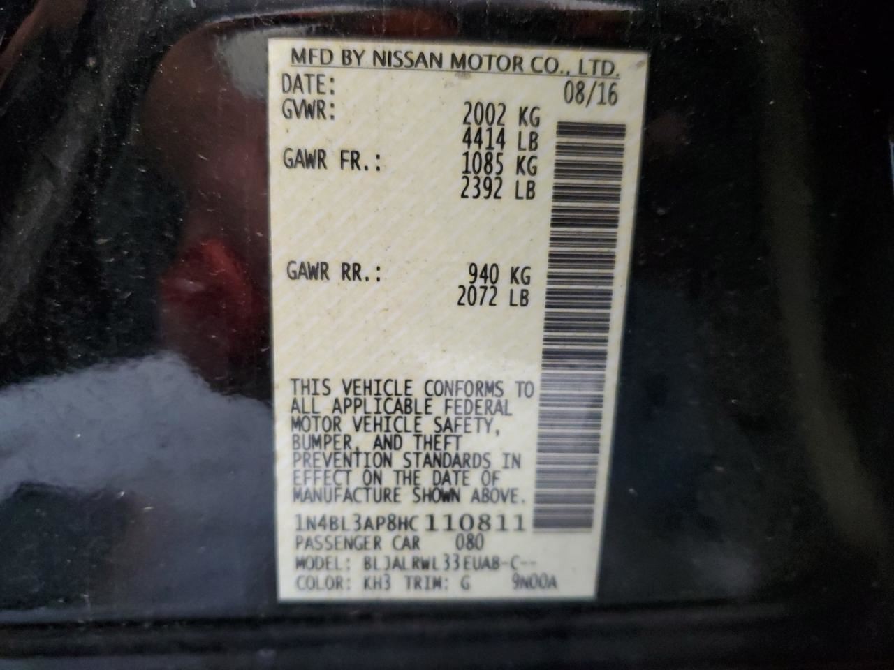 - VIN #: 1N4BL3AP8HC110811