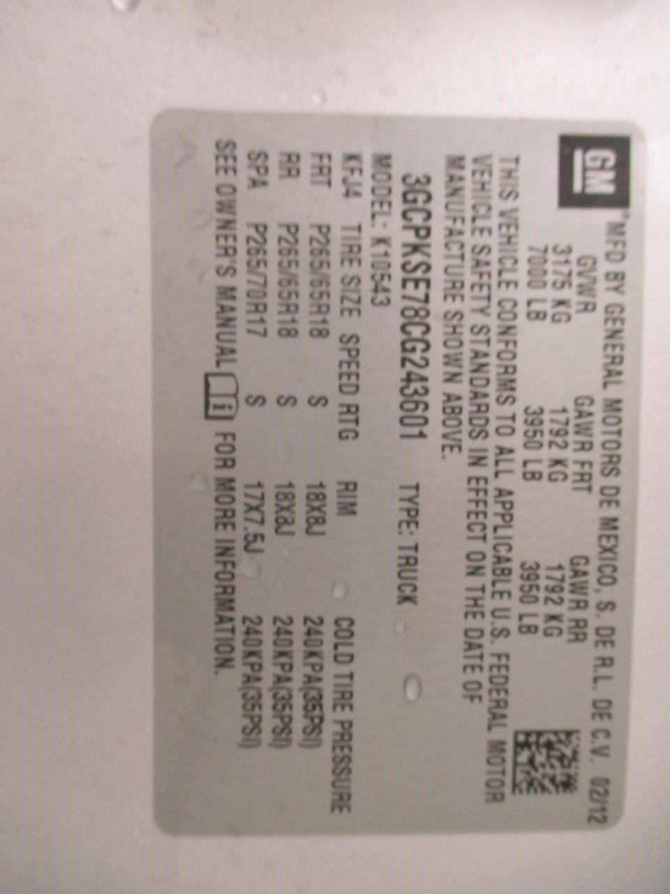- VIN: 3GCPKSE78CG243601