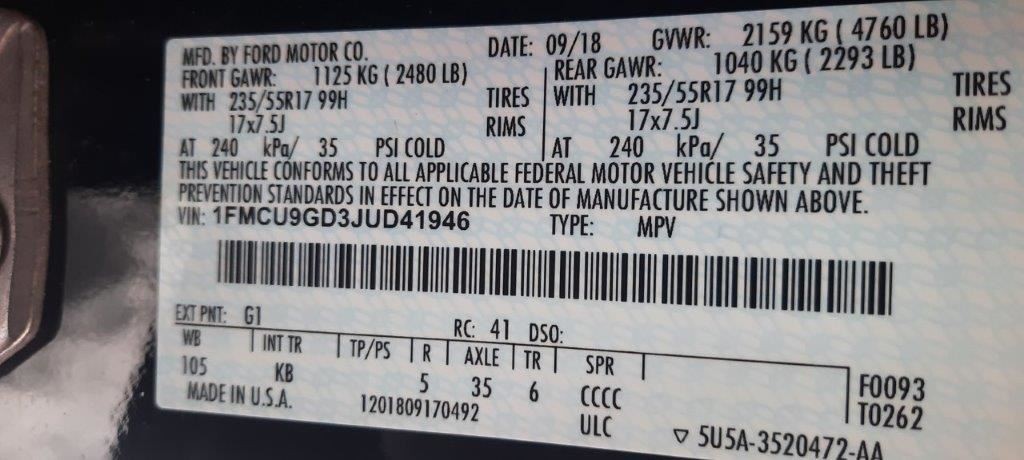 - VIN #: 1FMCU9GD3JUD41946