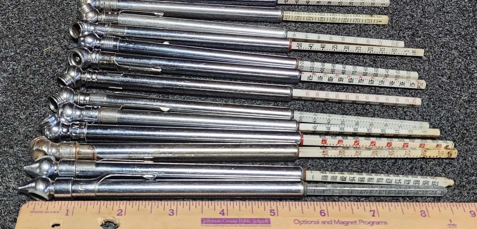 Lot of 14 Tire Air Pressure Gauges all used. i randomly tested about 5 and they all worked varying ranges of psi from 0-20psi. 0-50 psi, 0-120psi , etc. see picures