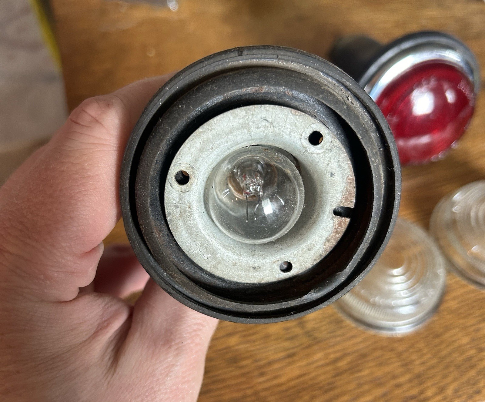 Original Lucas L488 tail light or front light double filament fixtures. Both red and clear lenses come with the fixtures. Sold AS IS due to age. Shipping listed for continental US only. Please ask for other locations.