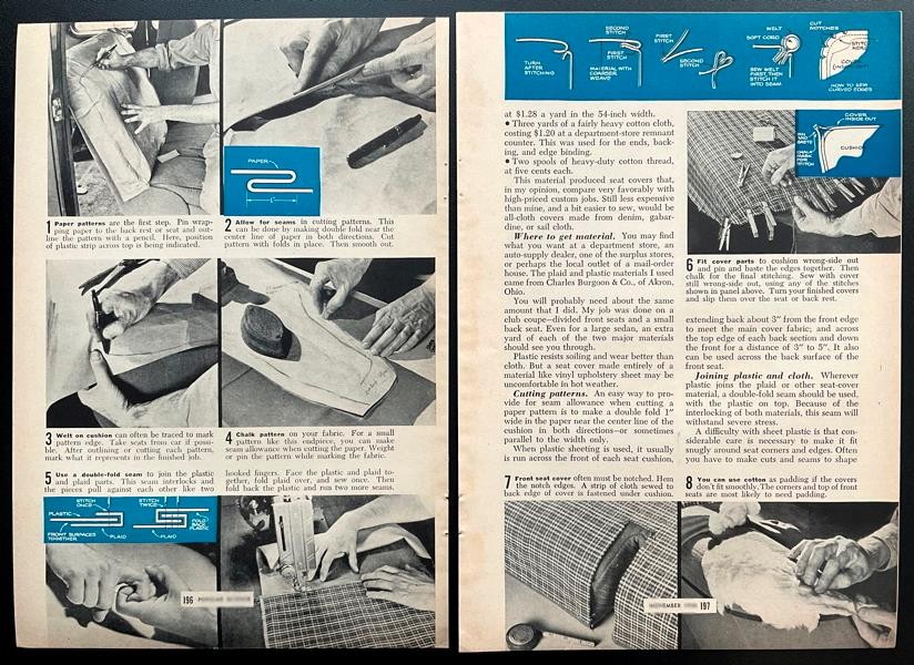 A vintage pictorial with Details and HowTo methods and tips for making custom fit seat covers. Best for old style bench seats (not bucket seats). This is an original 5 page magazine article from 1950 Page measures 6 1/2" x 9". We do not photocopy these. Items shipped upon receipt of payment.** ### Shipping - **Multiple Items may be grouped to save on shipping. - Answers to Freqently Asked Questions can also be found there.