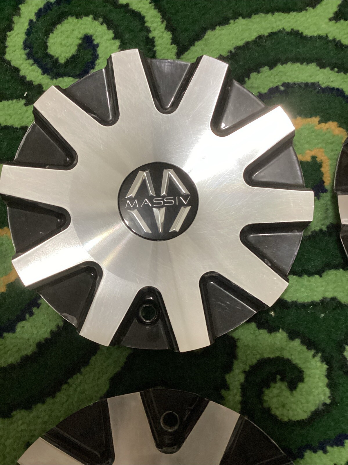 **Enhance the look of your Massiv Wheel with this sleek and stylish Black Silver Center Cap. Made from high-quality Aluminum, Chrome, and Plastic materials, this cap is designed to withstand the wear and tear of everyday use. The glossy and metallic finish adds a touch of elegance to your vehicle, making it stand out from the rest.** **This 1-piece center cap is compatible with the rear, left, front, and right placement on your Massiv Wheel. The emblem type is Massiv and the outside diameter is 7-3/8"OD. This item comes with no manufacturer warranty and is not a vintage or performance part. Purchase this center cap today to add a touch of sophistication to your ride.used item showing normal wearing overall still intact 1piece,**