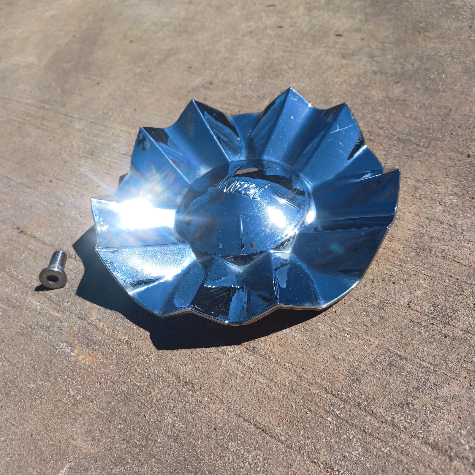 Mazzi custom wheel center cap, chrome, part number CAP-310 02 cracked bolt hole