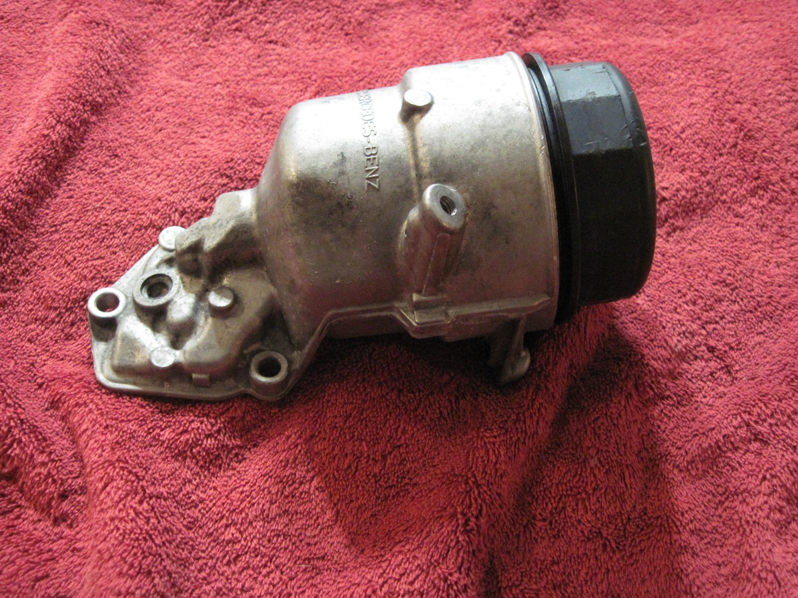 Original oil filter canister housing for Mercedes-Benz. Engine or vehicle application unknown.